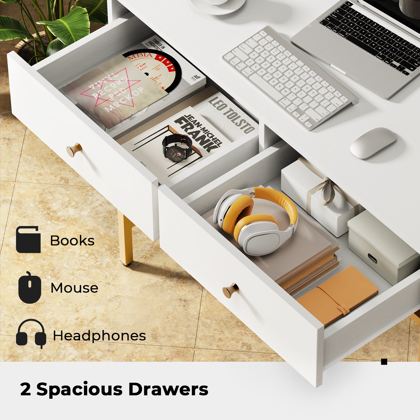 - [Elegant Statement]: Even working can be tasteful and soothing with this white writing desk with drawers. White finish, rectangular contour, and glossy gold handles and frame of this small white desk lift your working time up