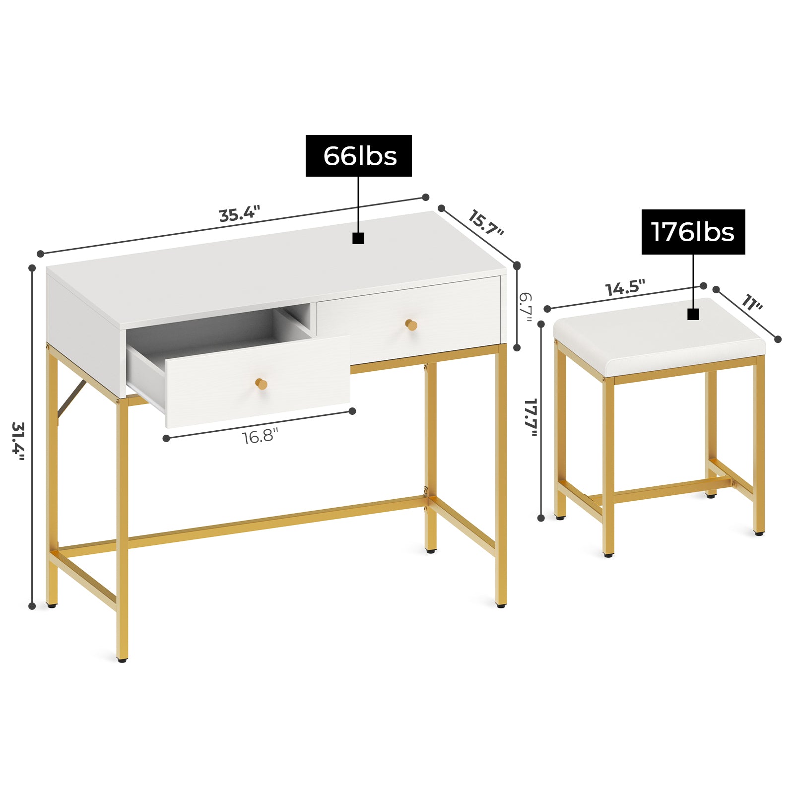 SUPERJARE 35.4" White and Gold Desk with 2 Drawers, Modern Makeup Vanity Desk with Padded Stool, Small Computer Desk Home Office Desk for Writing Study Bedroom
