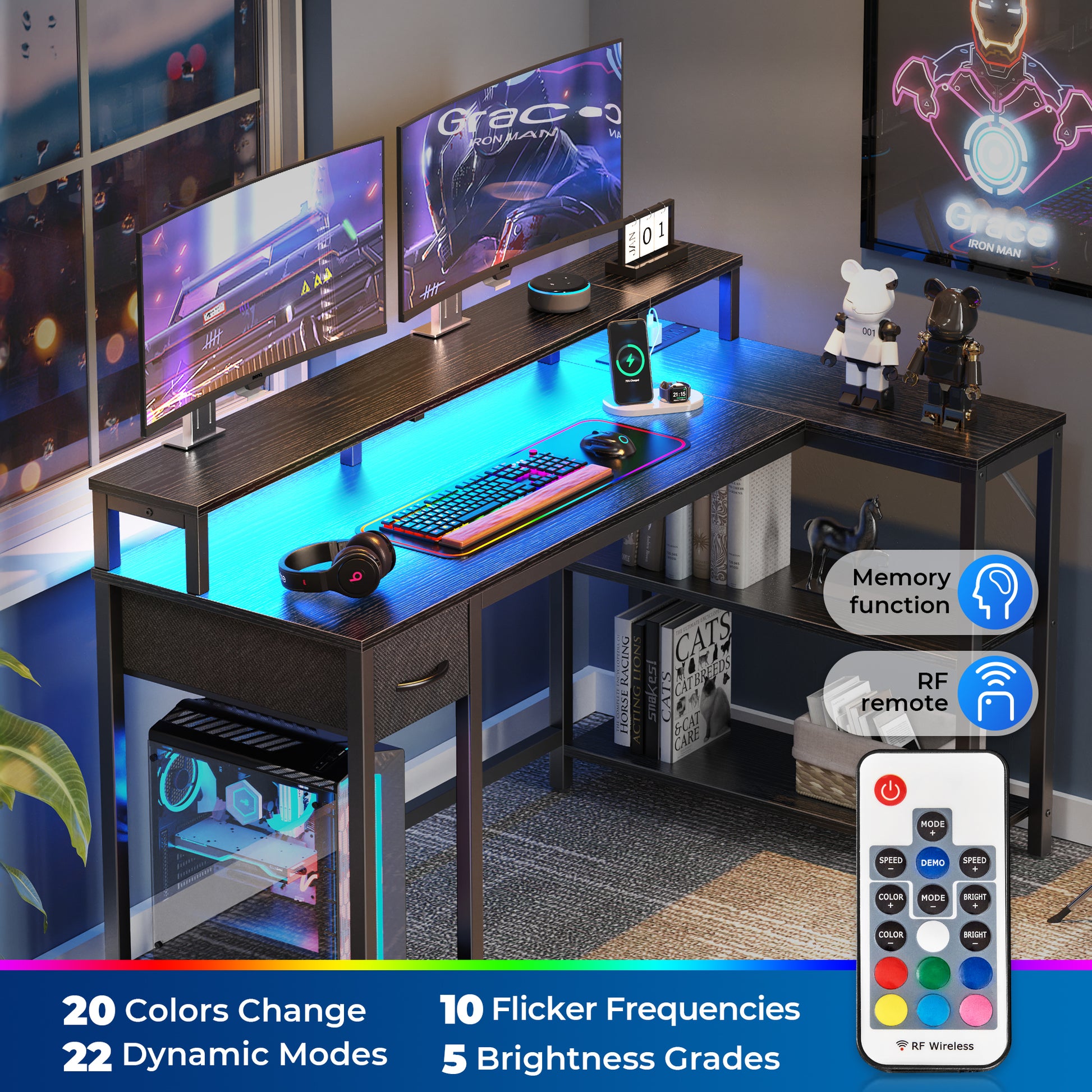 - 【L DESK WITH LED LIGHTS】PATENT PENDING! This home office desk features built-in LED lighting with 20 colors, 22 modes, 5 adjustable brightness levels, and 10 flicker frequencies to create beautiful ambiance that enhances your room. The L shaped design suits for corner small space perfectly.