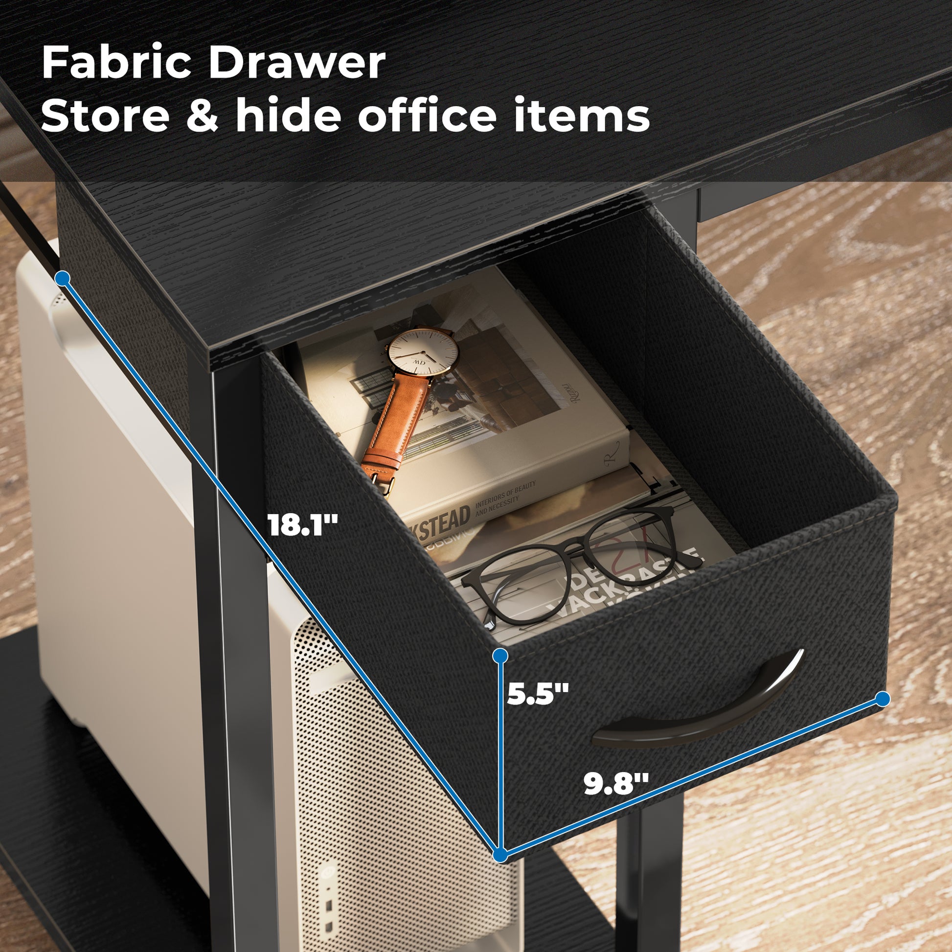- 【DESK WITH STORAGE】The desktop and 2 storage shelves on the side allow you to store unlimited office supplies. The pc tower can be placed on the bottom shelf and there is a fabric drawer to store stationery and other privacy items. Super practical design!
