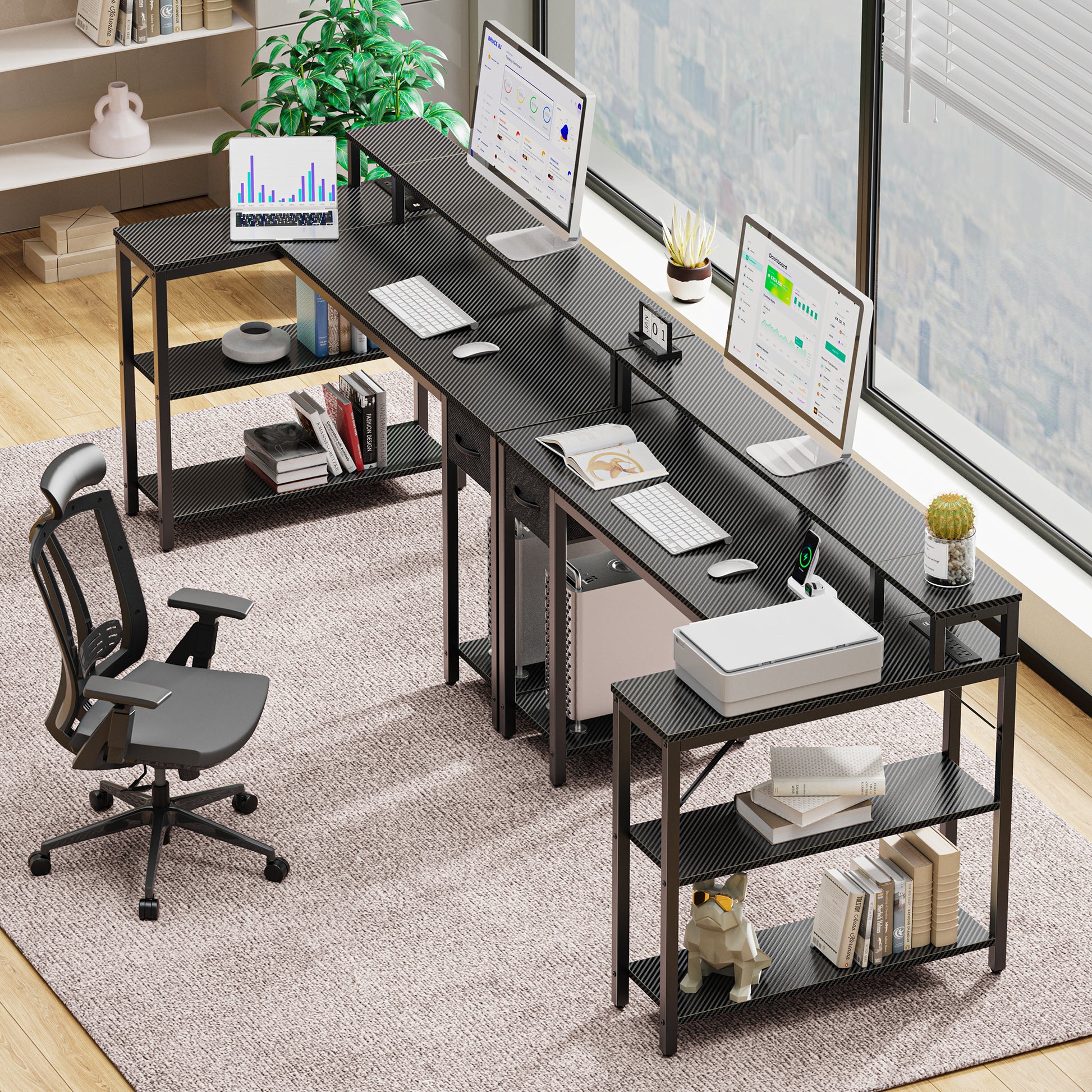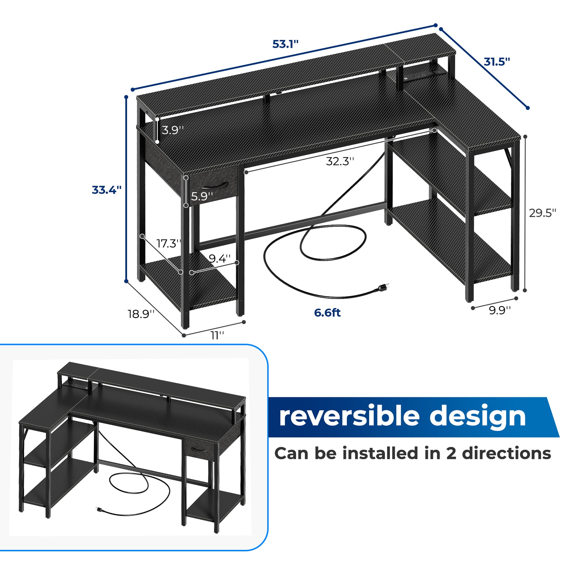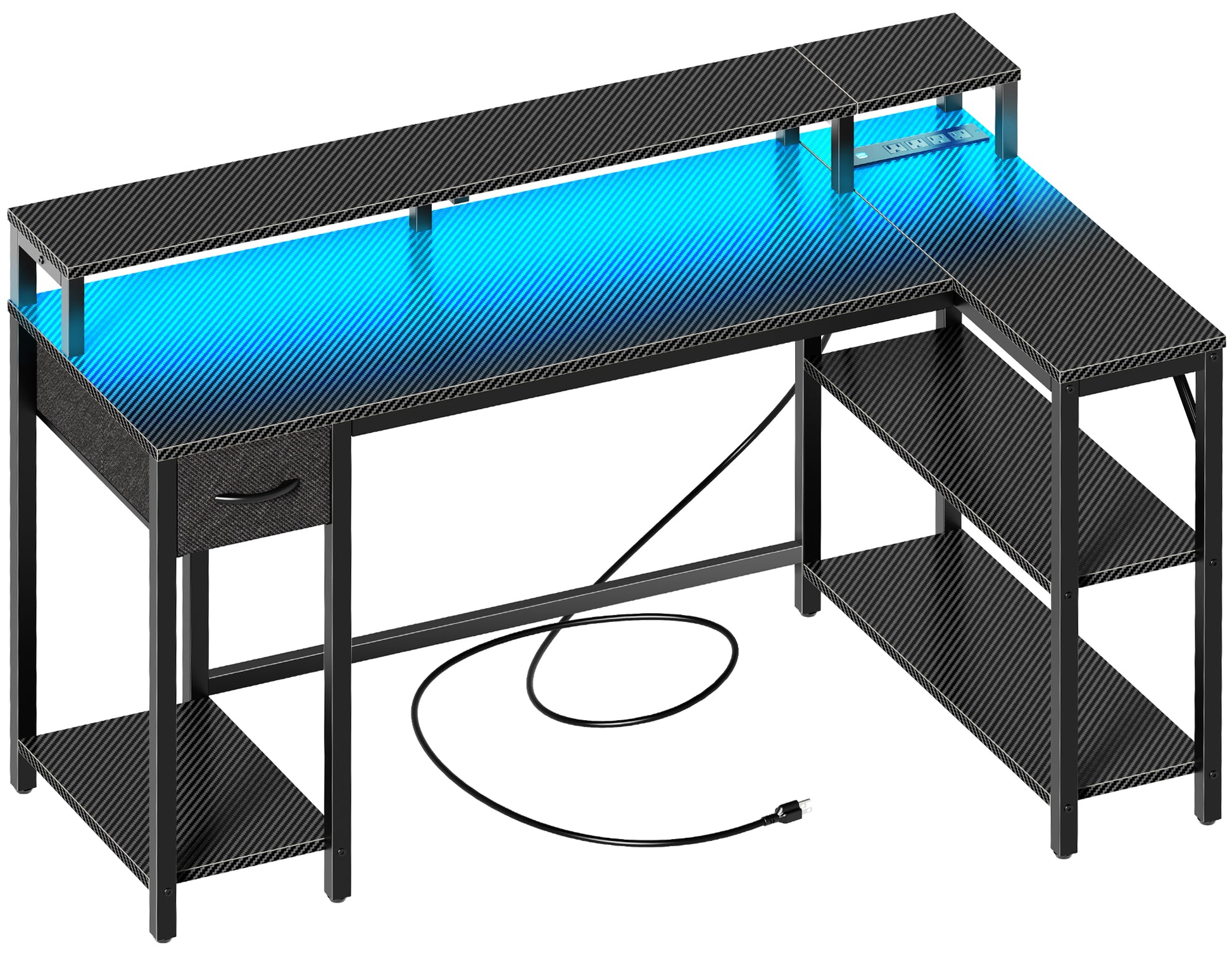 SUPERJARE 53 Inch L Shaped Desk with LED Lights & Power Outlets, Reversible Computer Desk with Shelves & Drawer, Corner Desk Home Office Desk, Carbon Fiber Black