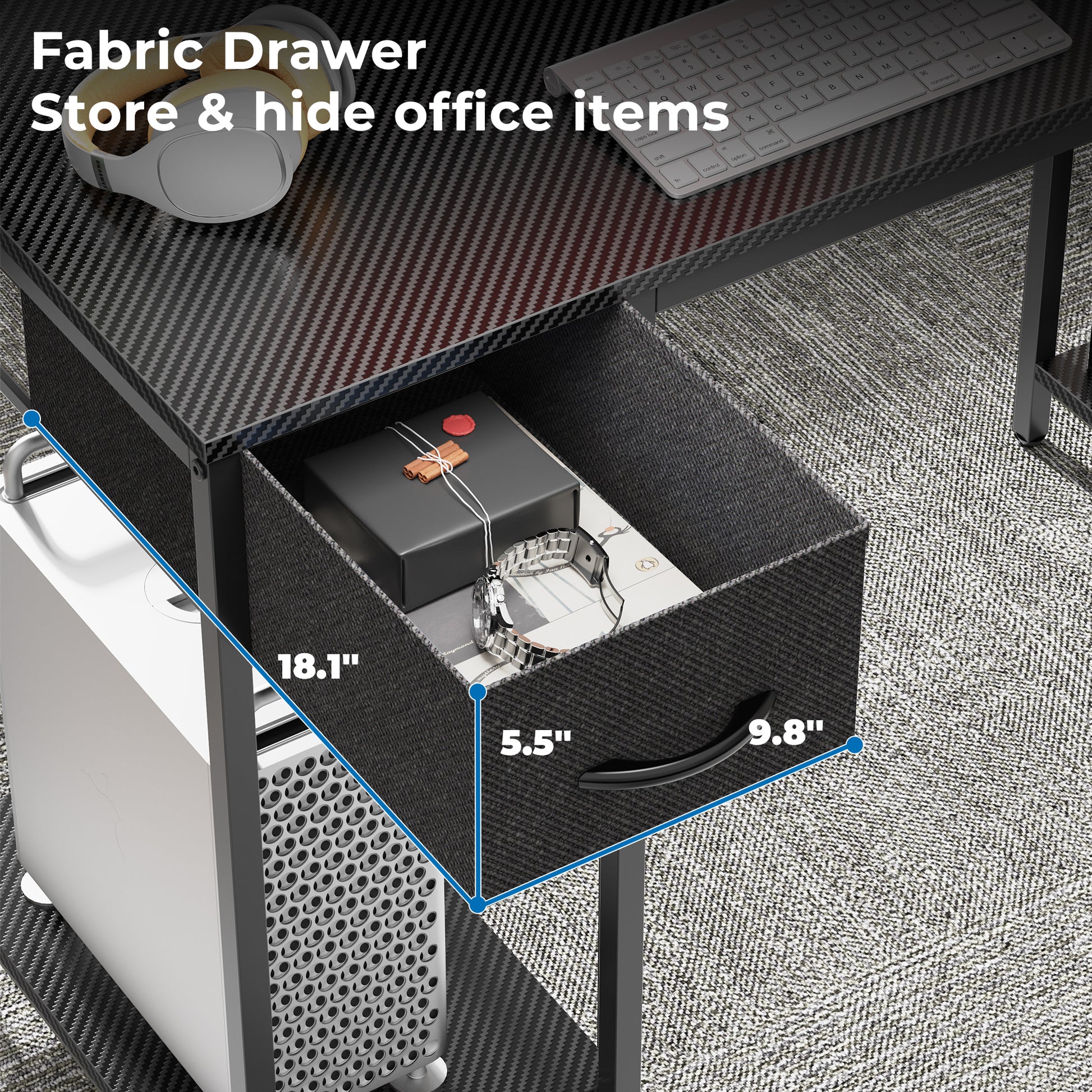 - 【DESK WITH STORAGE】The desktop and 2 storage shelves on the side allow you to store unlimited office supplies. The pc tower can be placed on the bottom shelf and there is a fabric drawer to store stationery and other privacy items. Super practical design