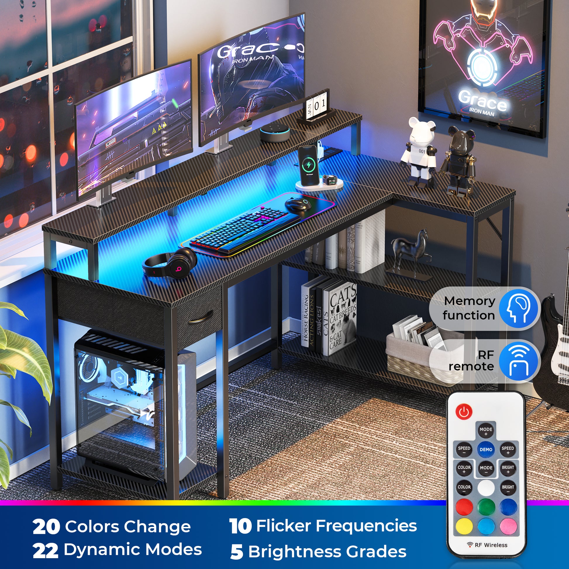 - 【L DESK WITH LED LIGHTS】PATENT PENDING! This home office desk features built-in LED lighting with 20 colors, 22 modes, 5 adjustable brightness levels, and 10 flicker frequencies to create beautiful ambiance that enhances your room. The L shaped design suits for corner small space perfectly