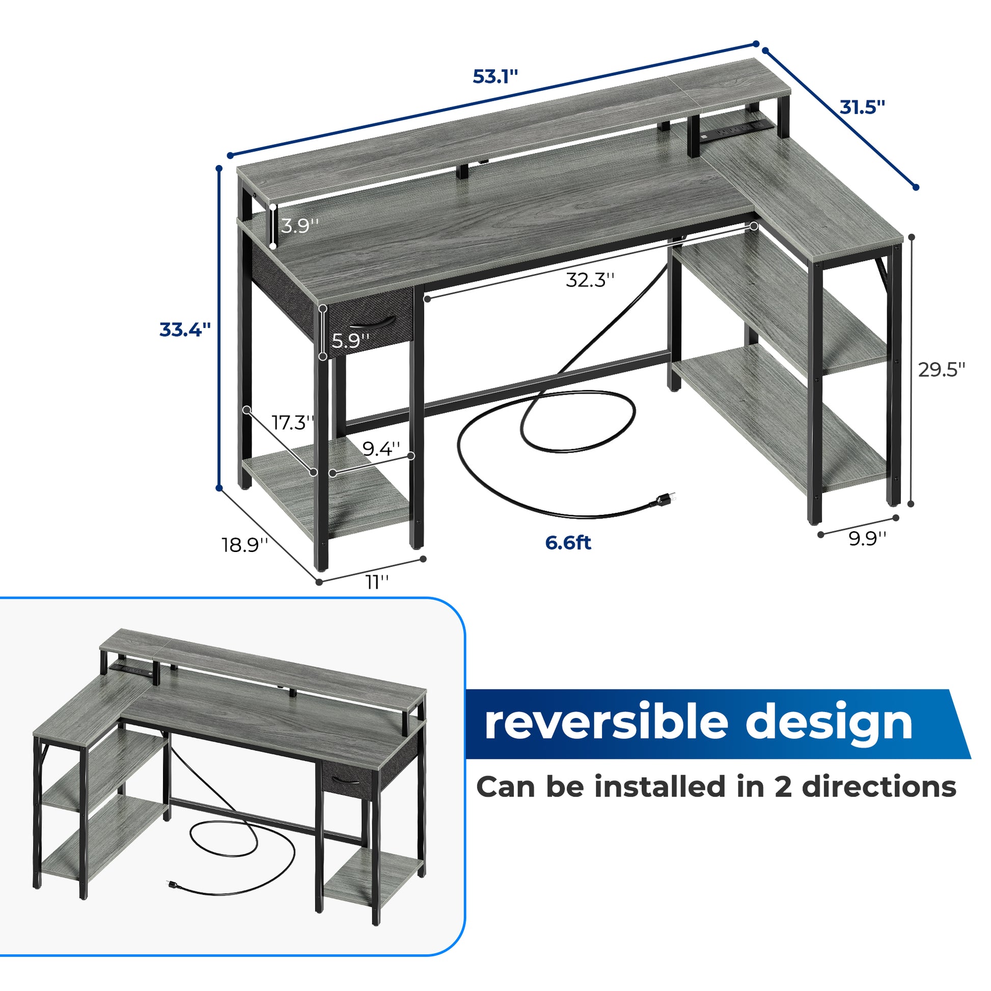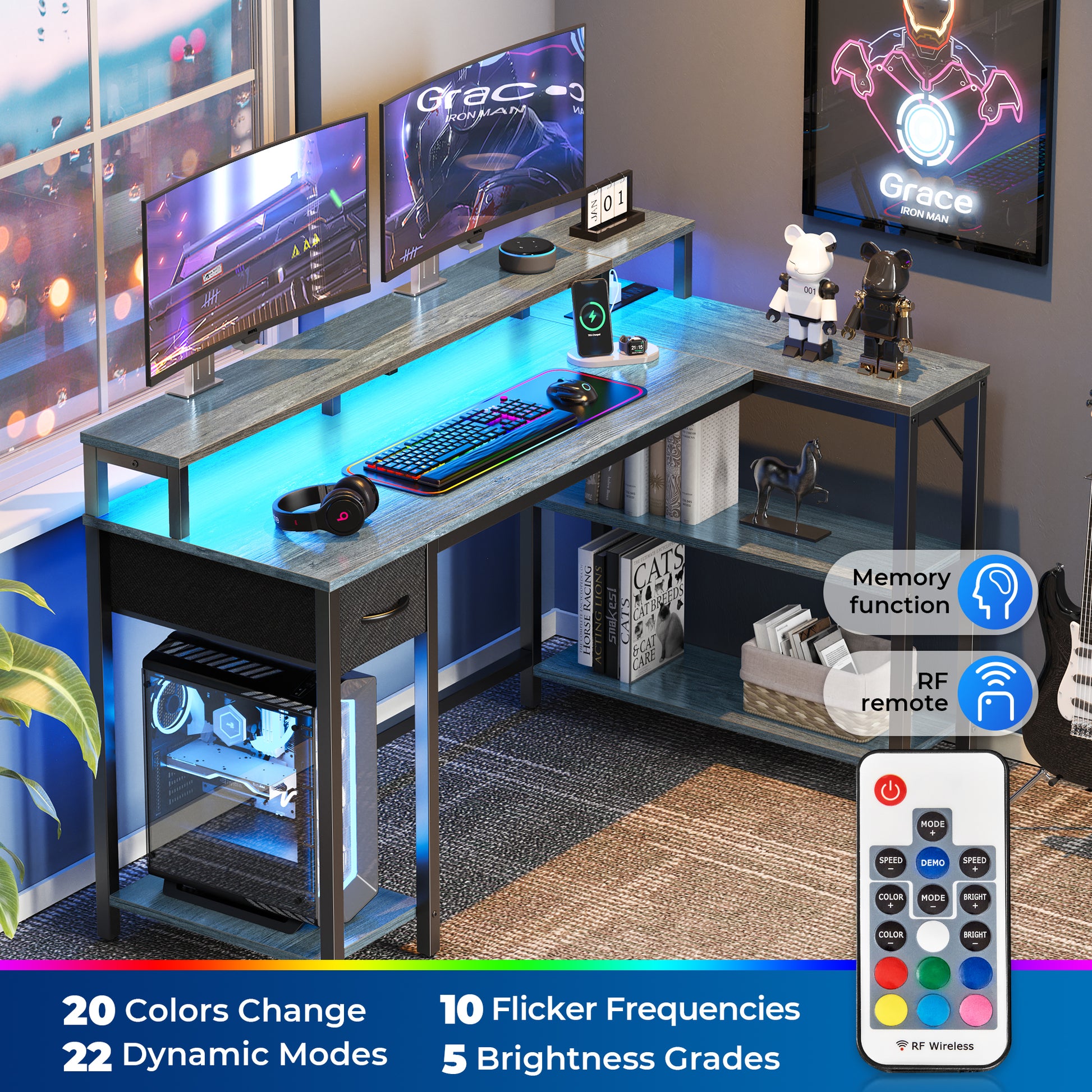 SUPERJARE 53 Inch L Shaped Desk with LED Lights & Power Outlets, Reversible Computer Desk with Shelves & Drawer, Corner Desk Home Office Desk, Grey