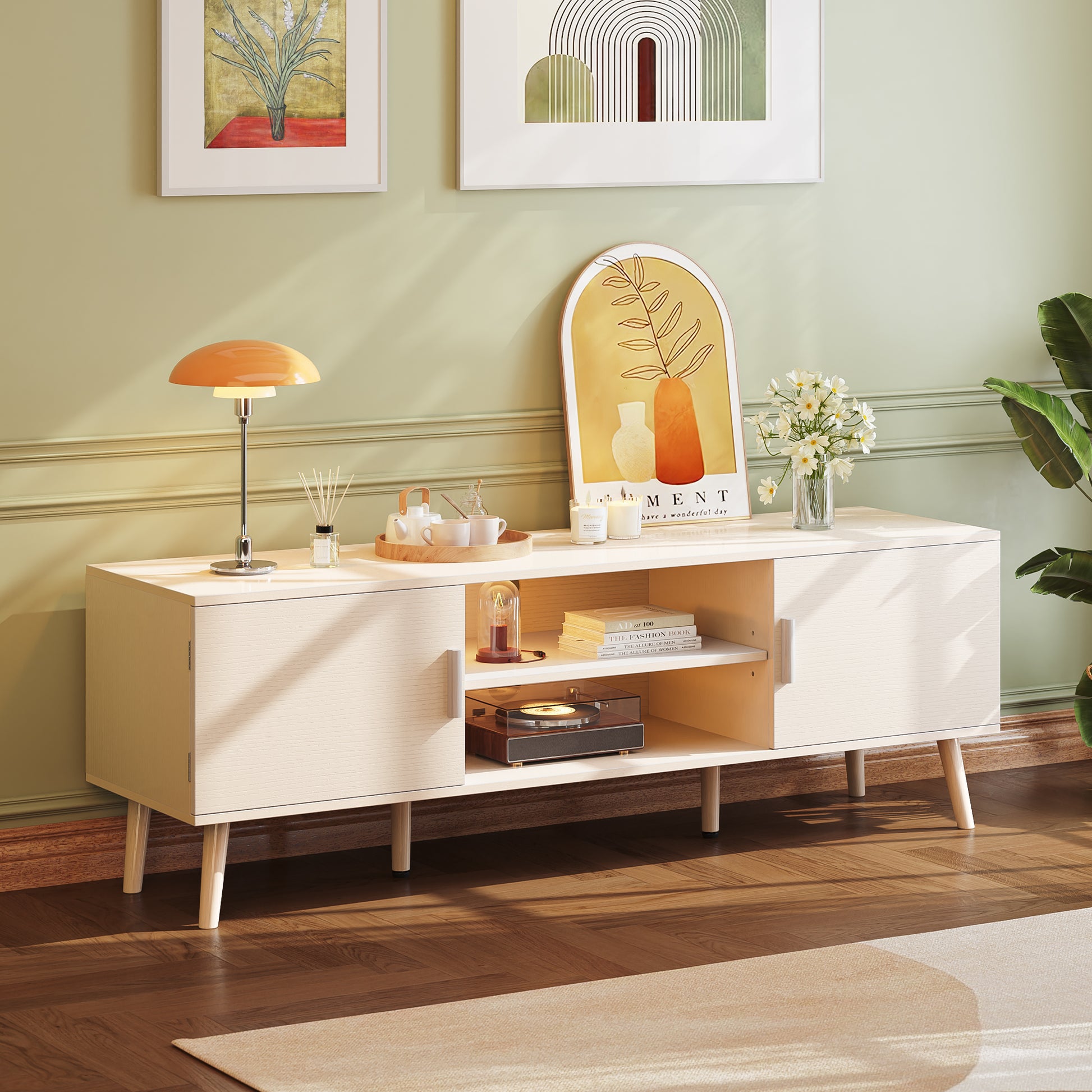 - [Support 65 Inches TV]: Suitable for TV up to 55 inches, 60 inches, 65 inches. Prop your TV on this tv entertainment center for strong support or mount your TV on the wall and use this media console cabinet as a decoration table for your TV supplies, ornaments, vases... The white finish adorn with rattan surface elevates modern vibe and enhances your movie nights