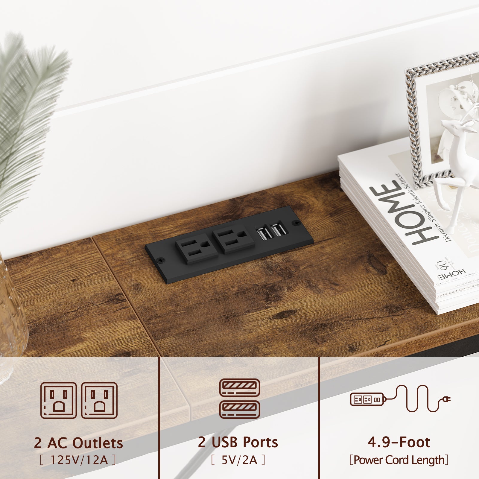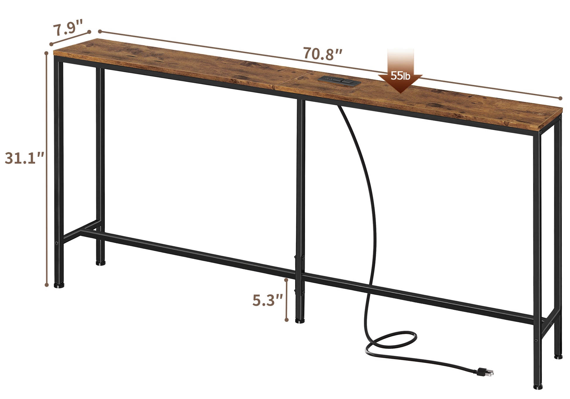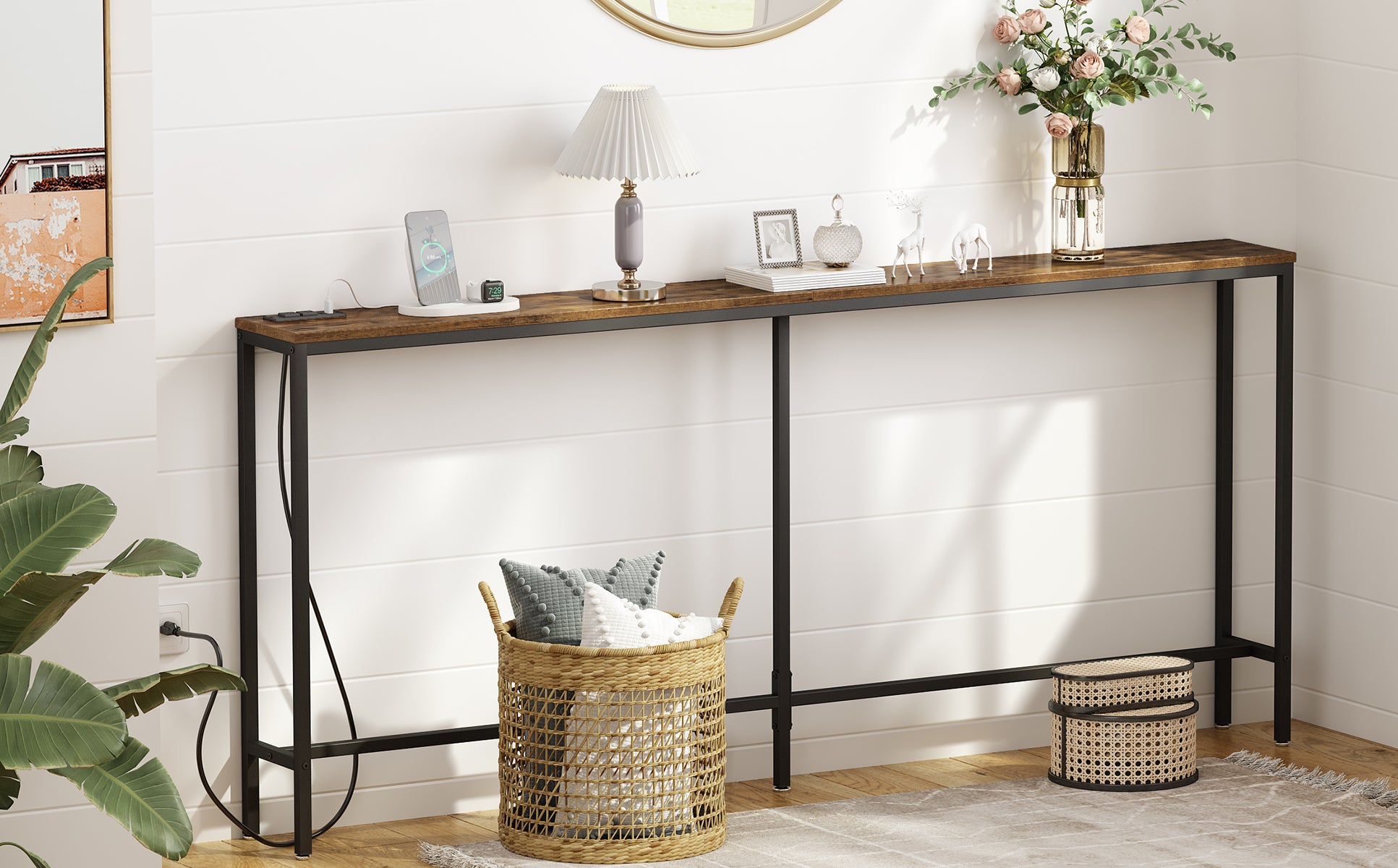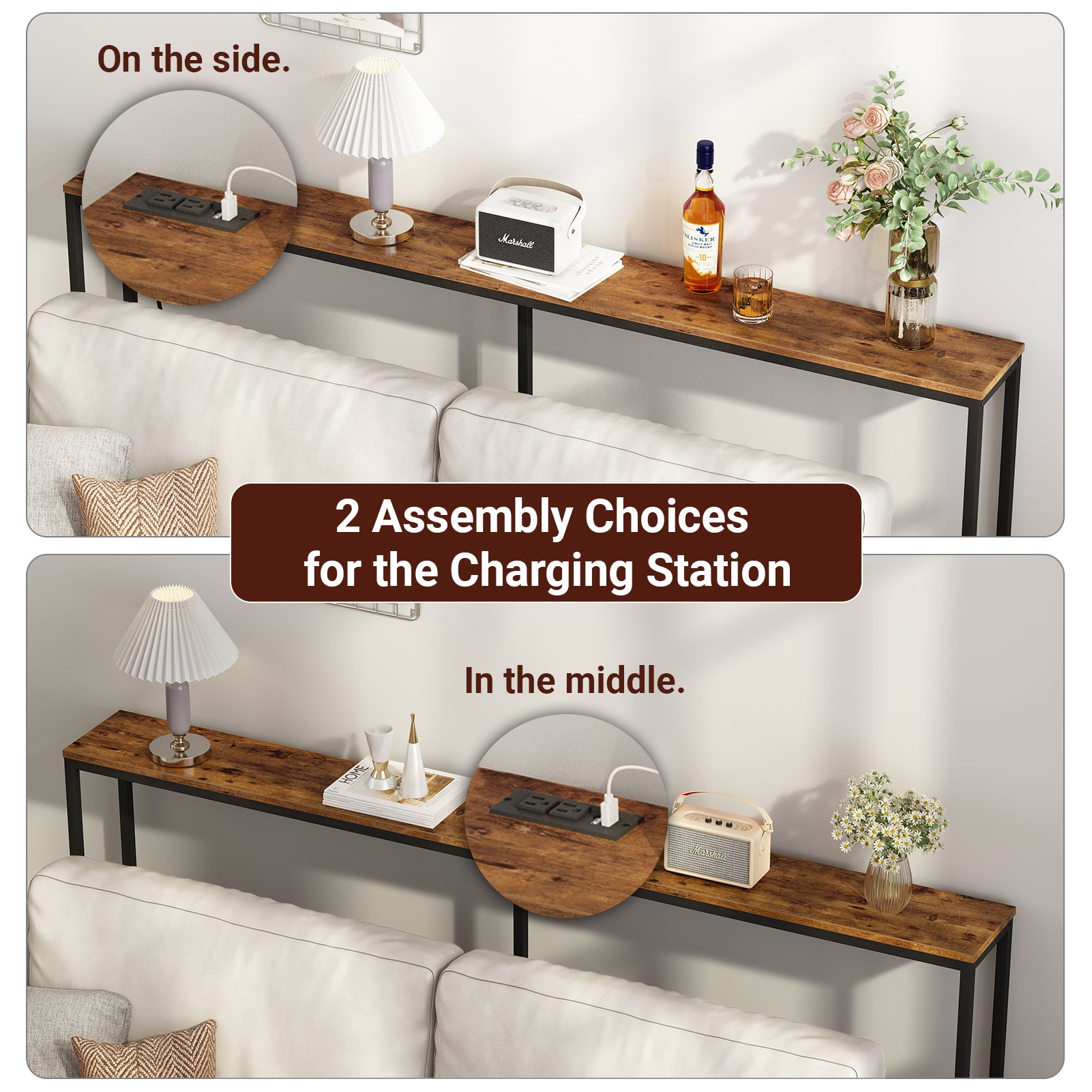 - [Welcome Power Outlets]: Invite this narrow entryway table to inspire your life! 2 outlets and 2 USB Ports are totally enough for your charging needs. Lamps, phones, iPad, fans, even decorative light strings are all covered