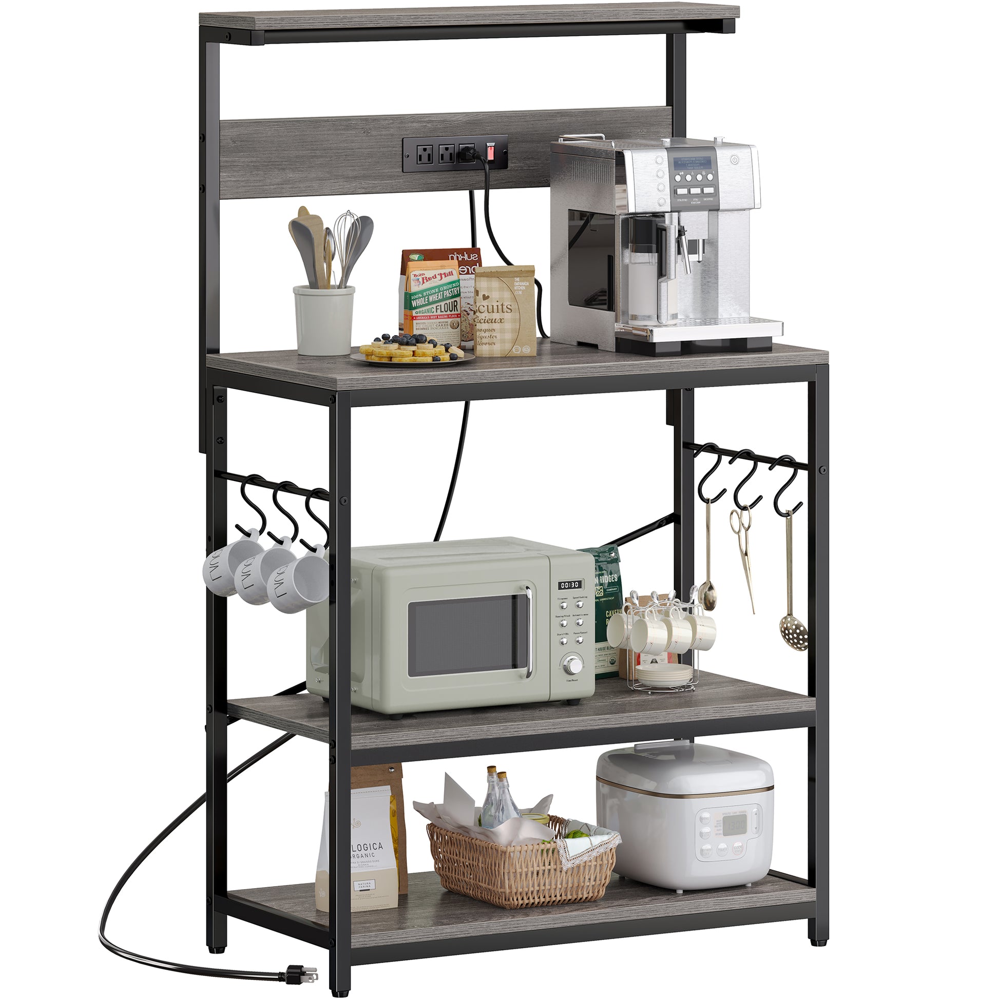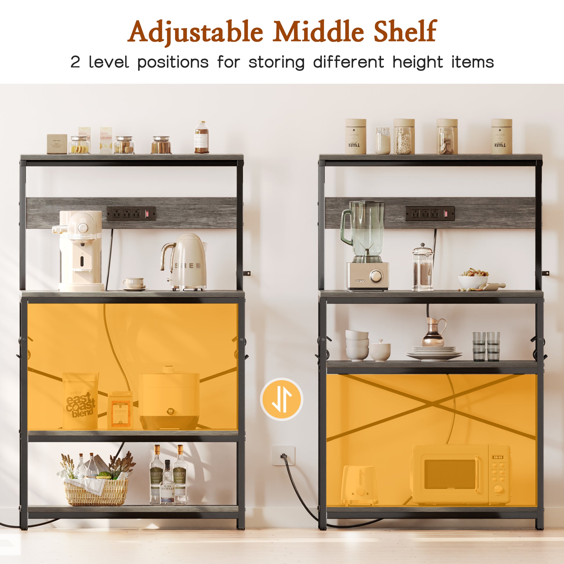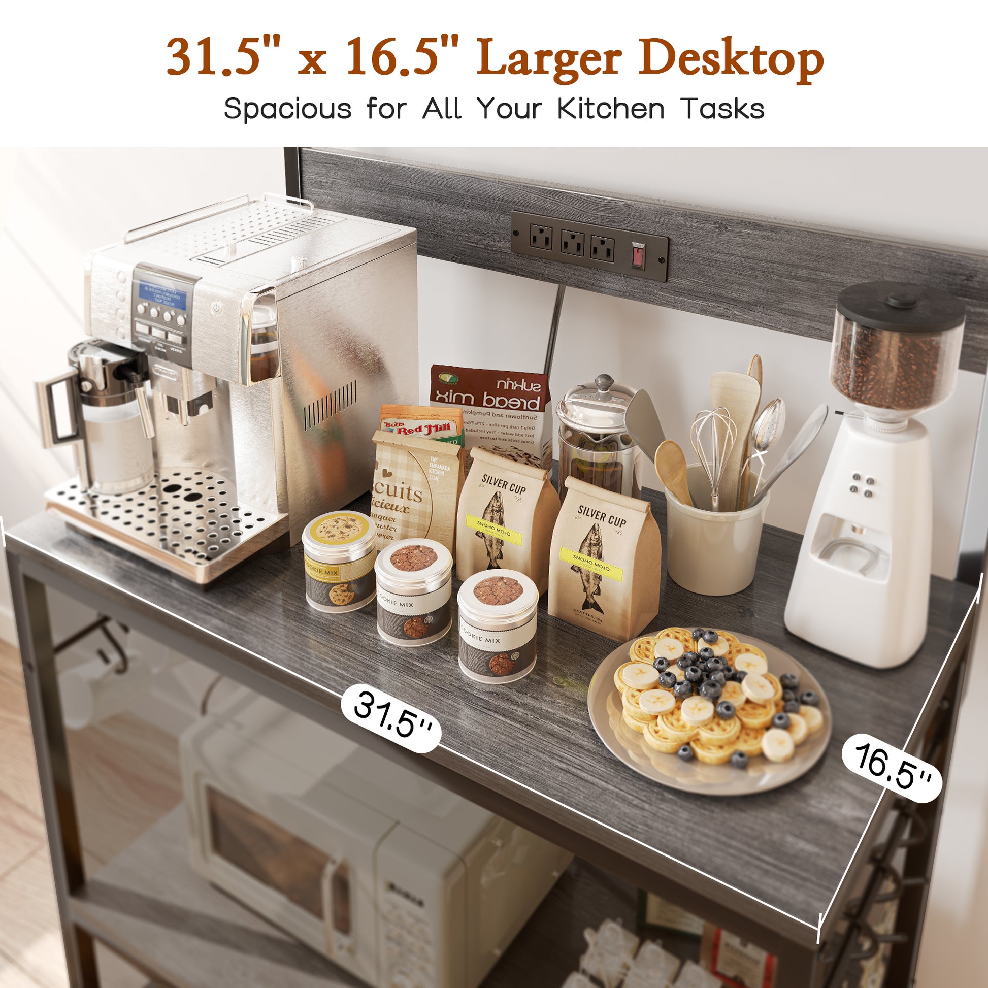 SUPERJARE Bakers Rack with Power Outlets, Microwave Stand, 31.5 X 16.5 Inch Larger Desktop, Kitchen Storage Rack with Adjustable Middle Shelf, 6 S-Shaped Hooks, Coffee Bar Stand, Grey
