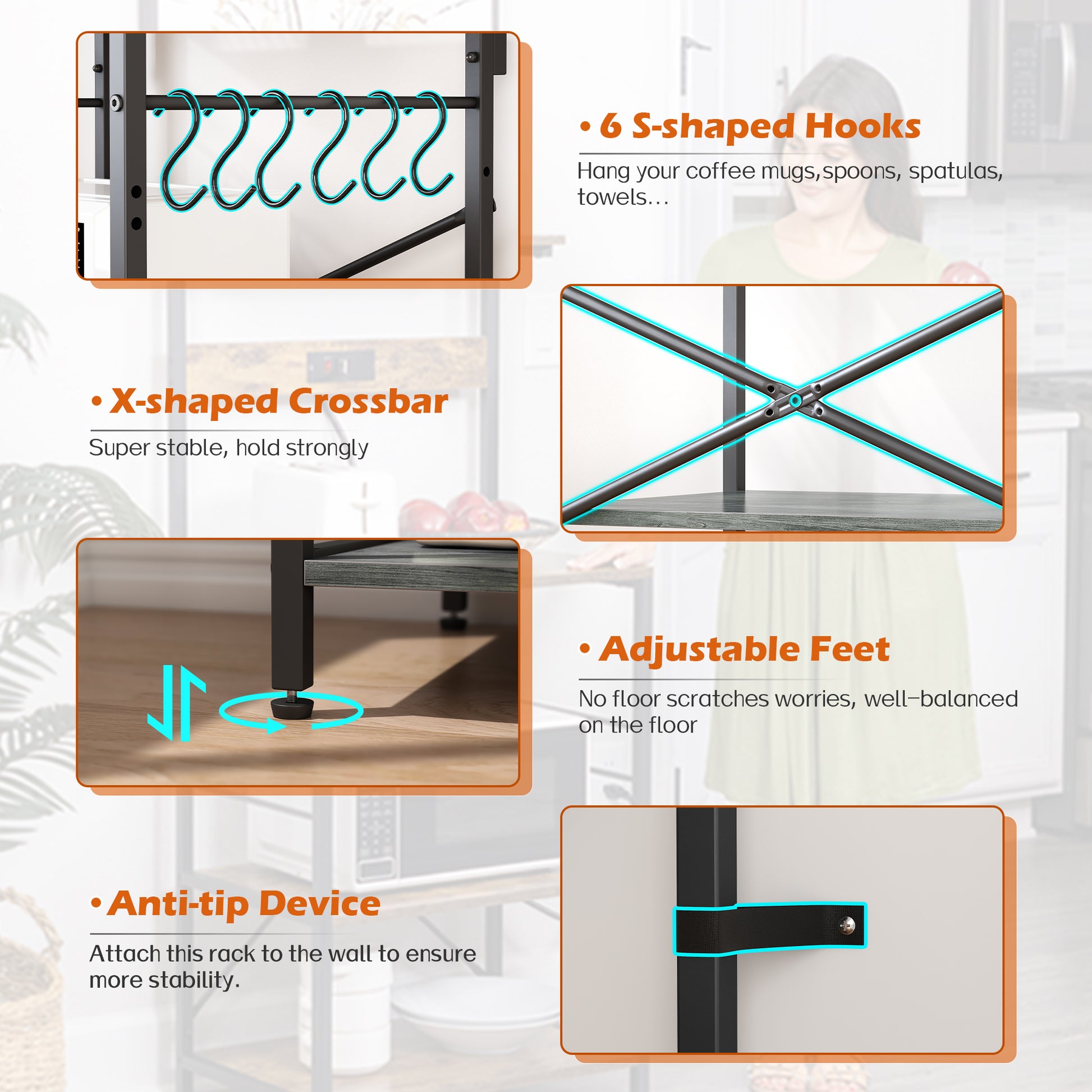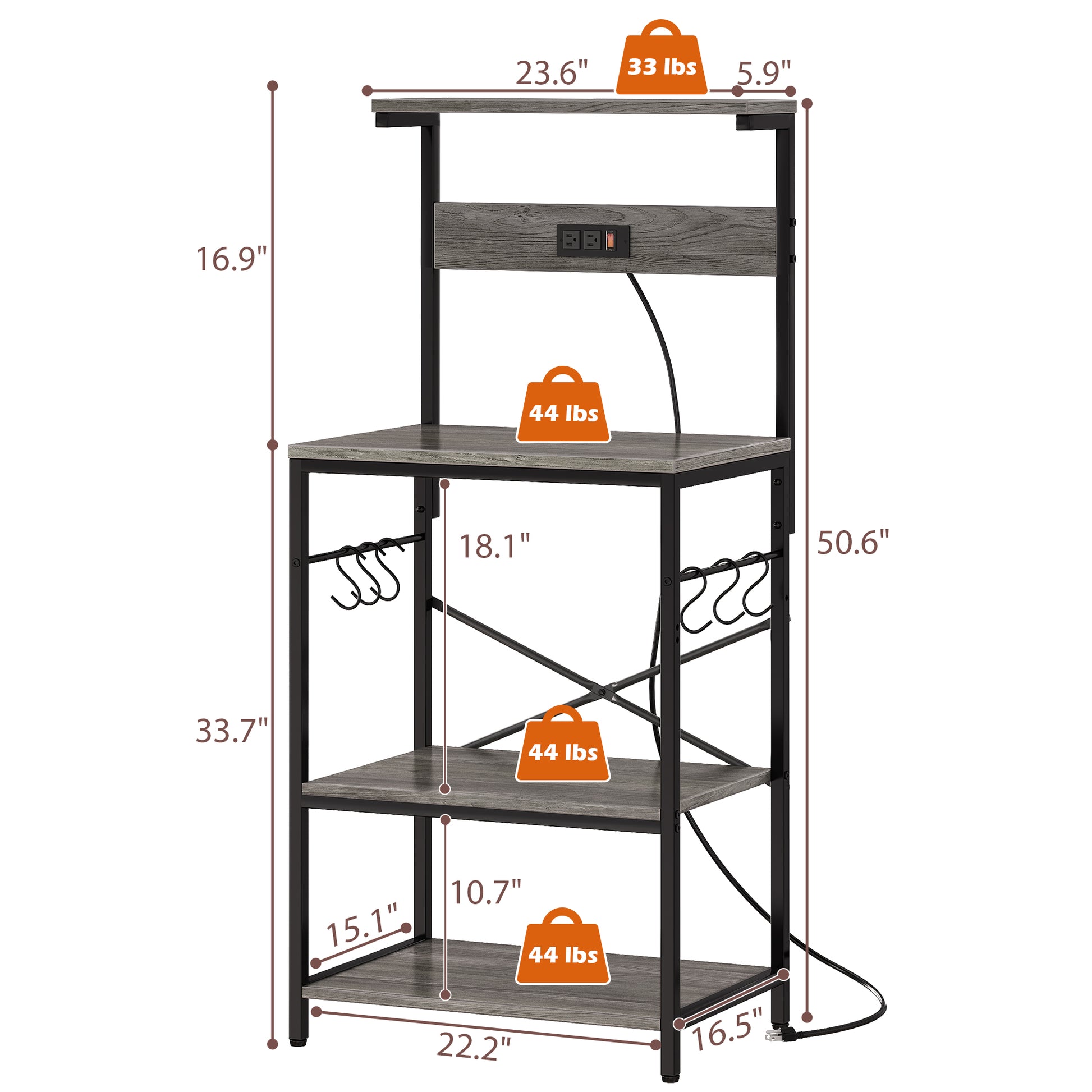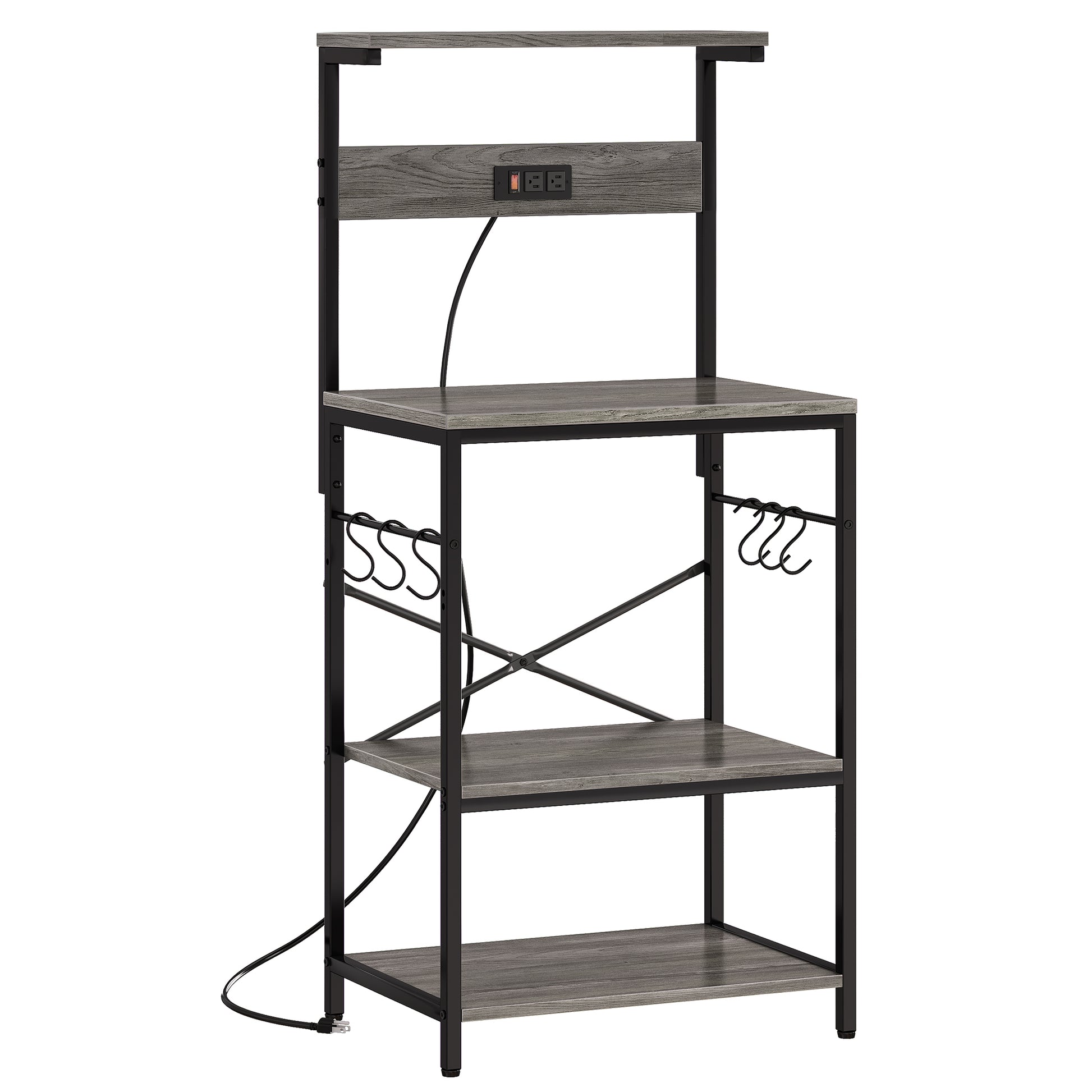 SUPERJARE Kitchen Bakers Rack with Power Outlet, Coffee Bar Table 4 Tiers, 6 S-shaped Hooks, Kitchen Storage Shelf Rack, Gray