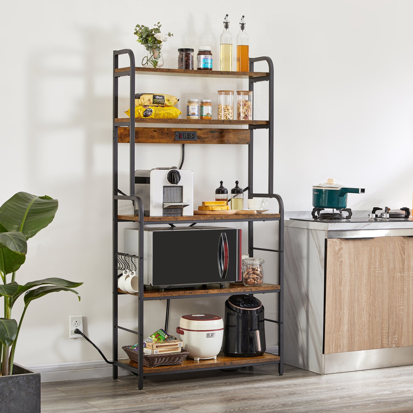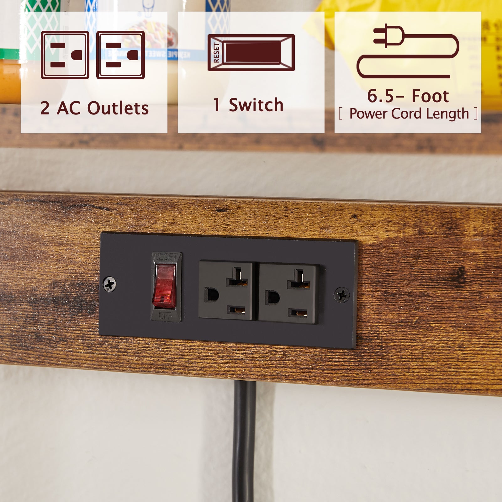 [Handy Power Outlets]: So many appliances! Are charging stations not enough? Get this bakers rack with power outlets, and the charging problem is easily solved. Wires are no longer tangled and hidden well to avoid disturbing the kitchen display space. Plus: The air switch ensures safety when in use. Patent pending
