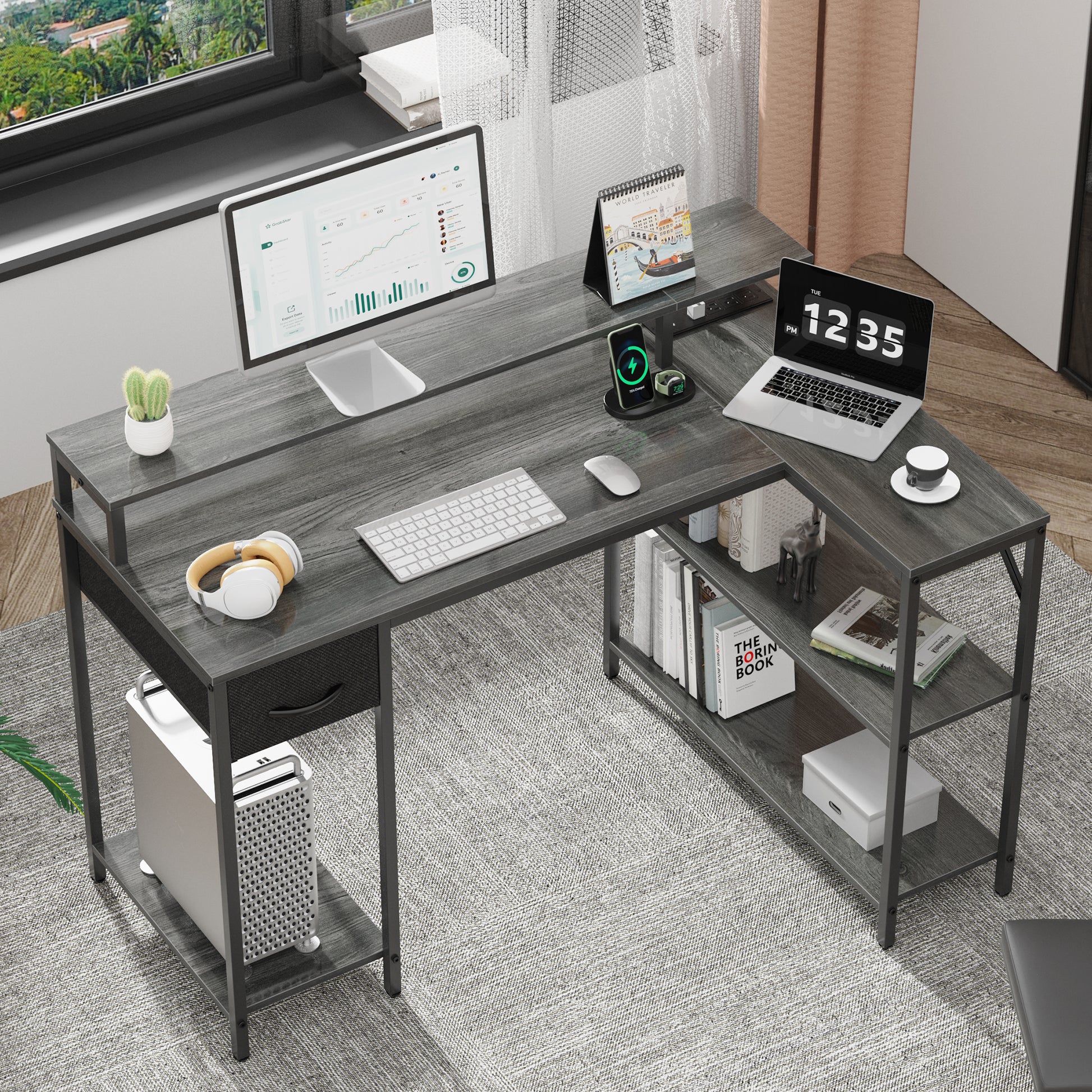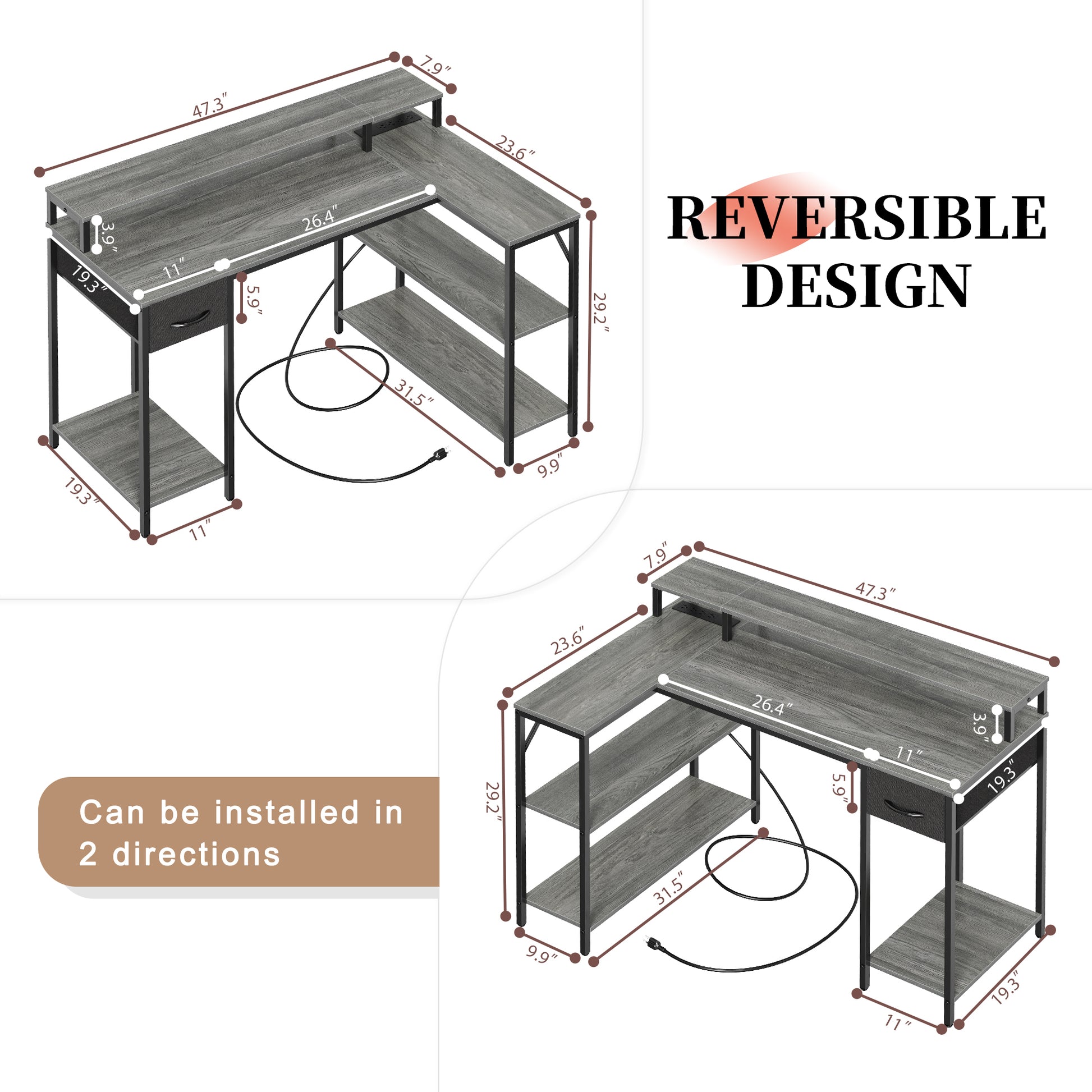 - 【REVERSIBLE L SHAPED DESK】With reversible design, this home office desk can be installed in 2 directions according to your needs, good choice for your bedroom, study and office. The L shaped design suits for corner space perfectly.