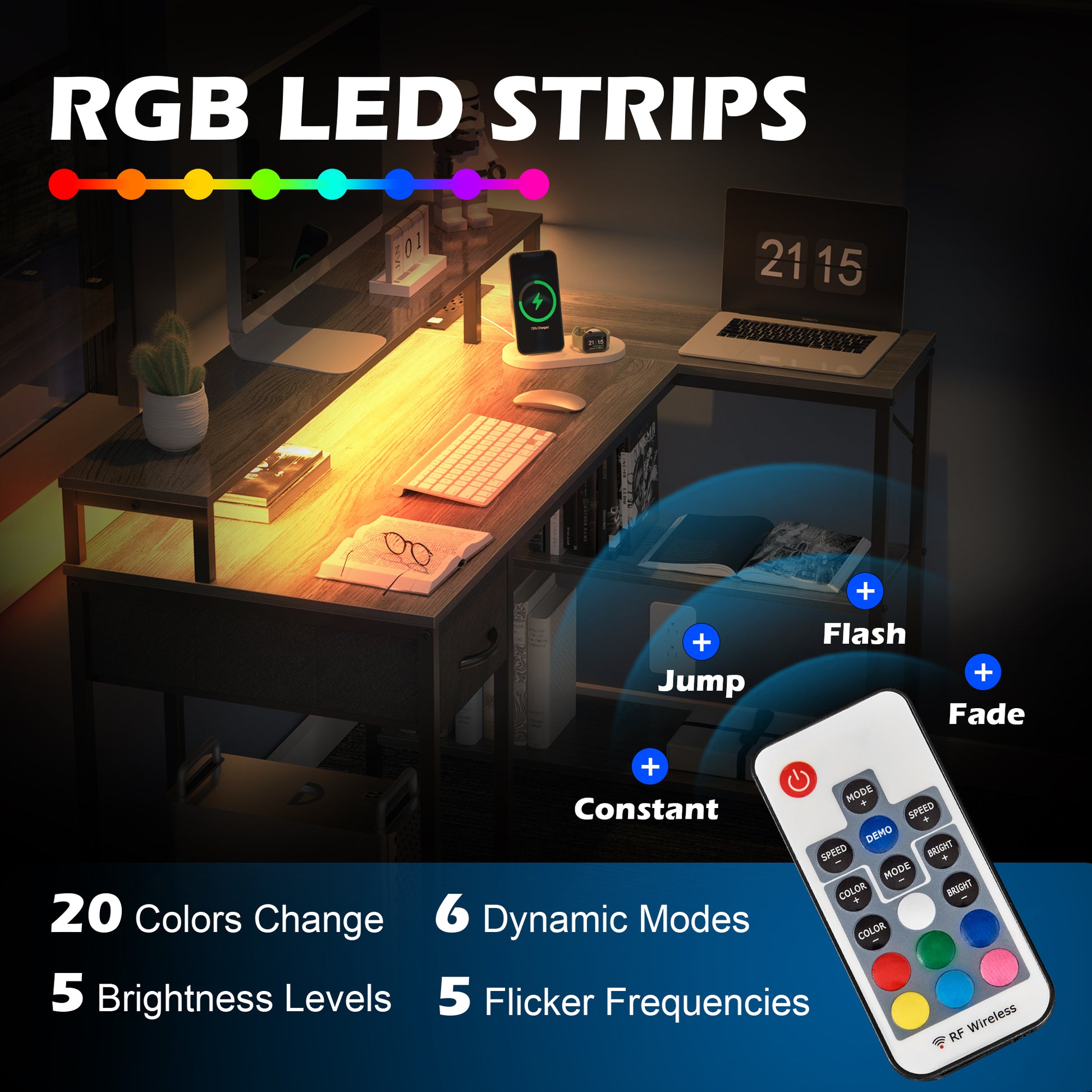 - 【L DESK WITH LED LIGHTS】PATENT PENDING! This home office desk features built-in LED lighting with 20 colors, 6 modes, 5 adjustable brightness levels, and 5 flicker frequencies to create beautiful ambiance that enhances your room. The L shaped design suits for corner small space perfectly.