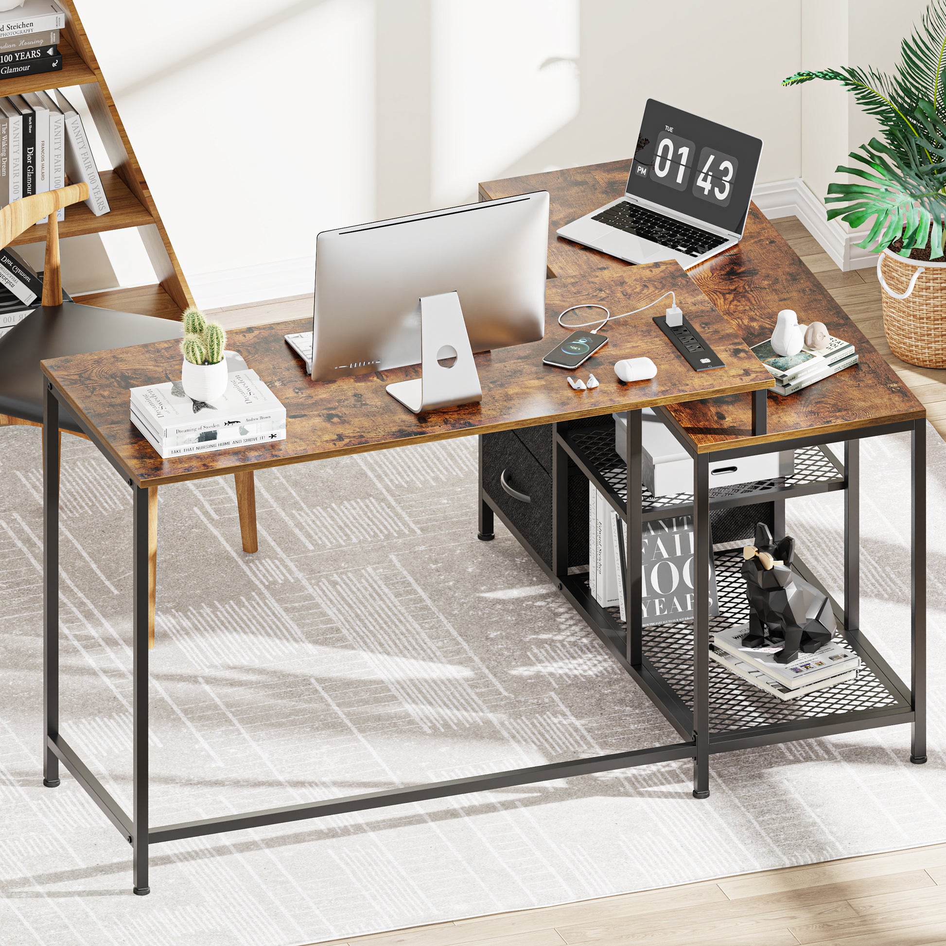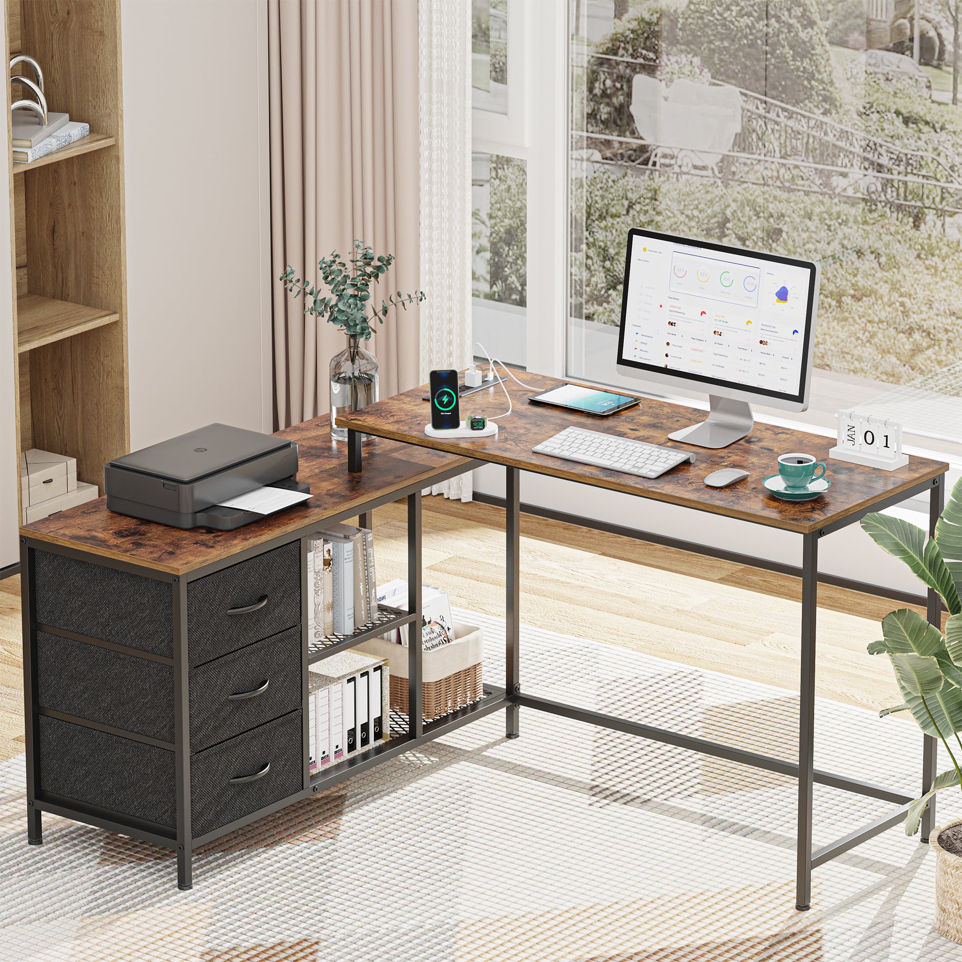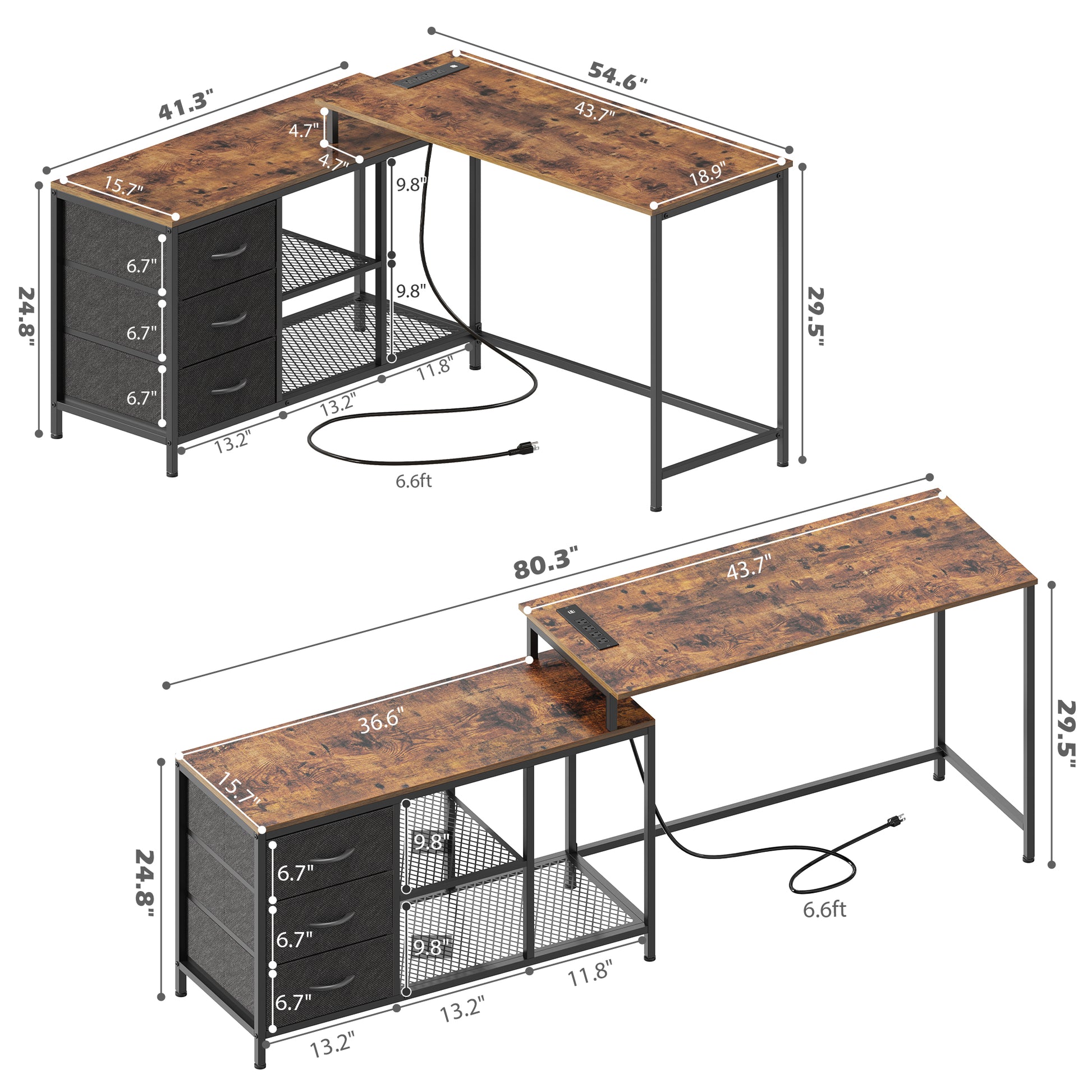 SUPERJARE L Shaped Desk with Power Outlets, Drawers & Shelves, Rustic Brown, 7944ZC