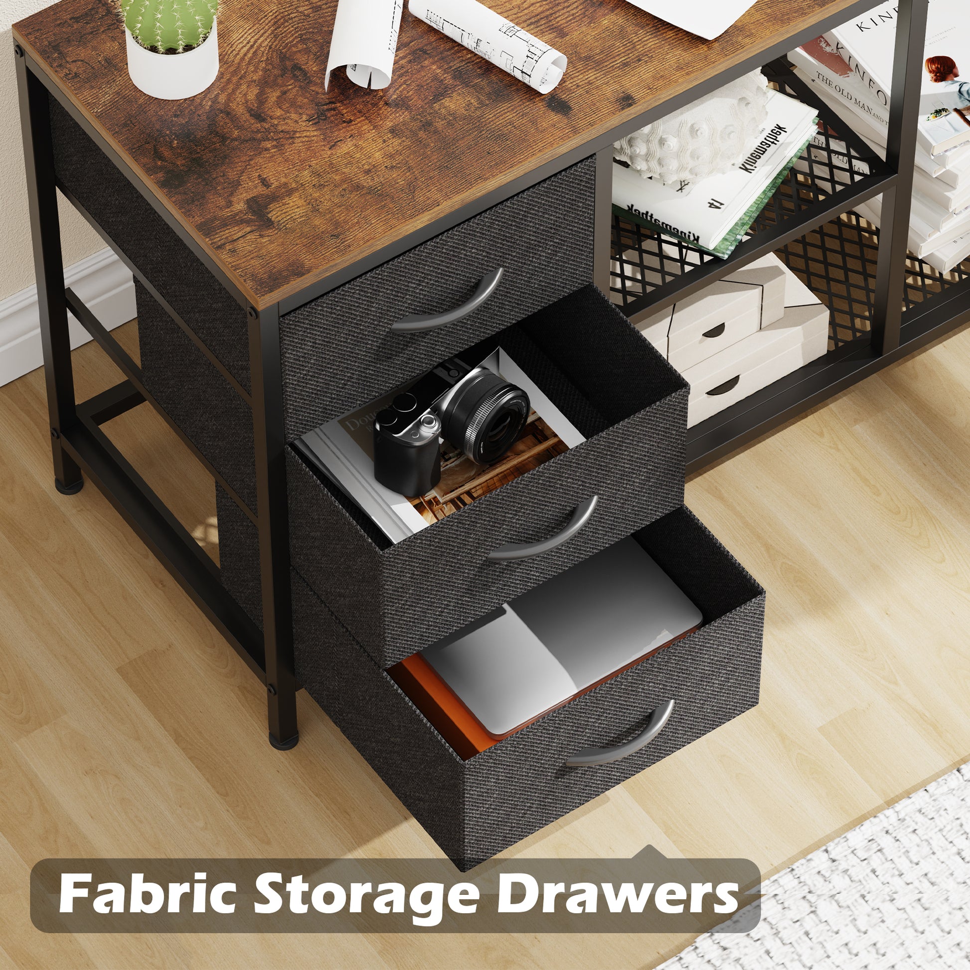 - 【COMPUTER DESK WITH DRAWERS】Lots of leg room. The desktop on the side can be used for printers and so on. 3 fabric drawers help store files, stationery and other privacy items. The grid bookshelf under the desk allow you to store unlimited office supplies and documents. Super practical design!