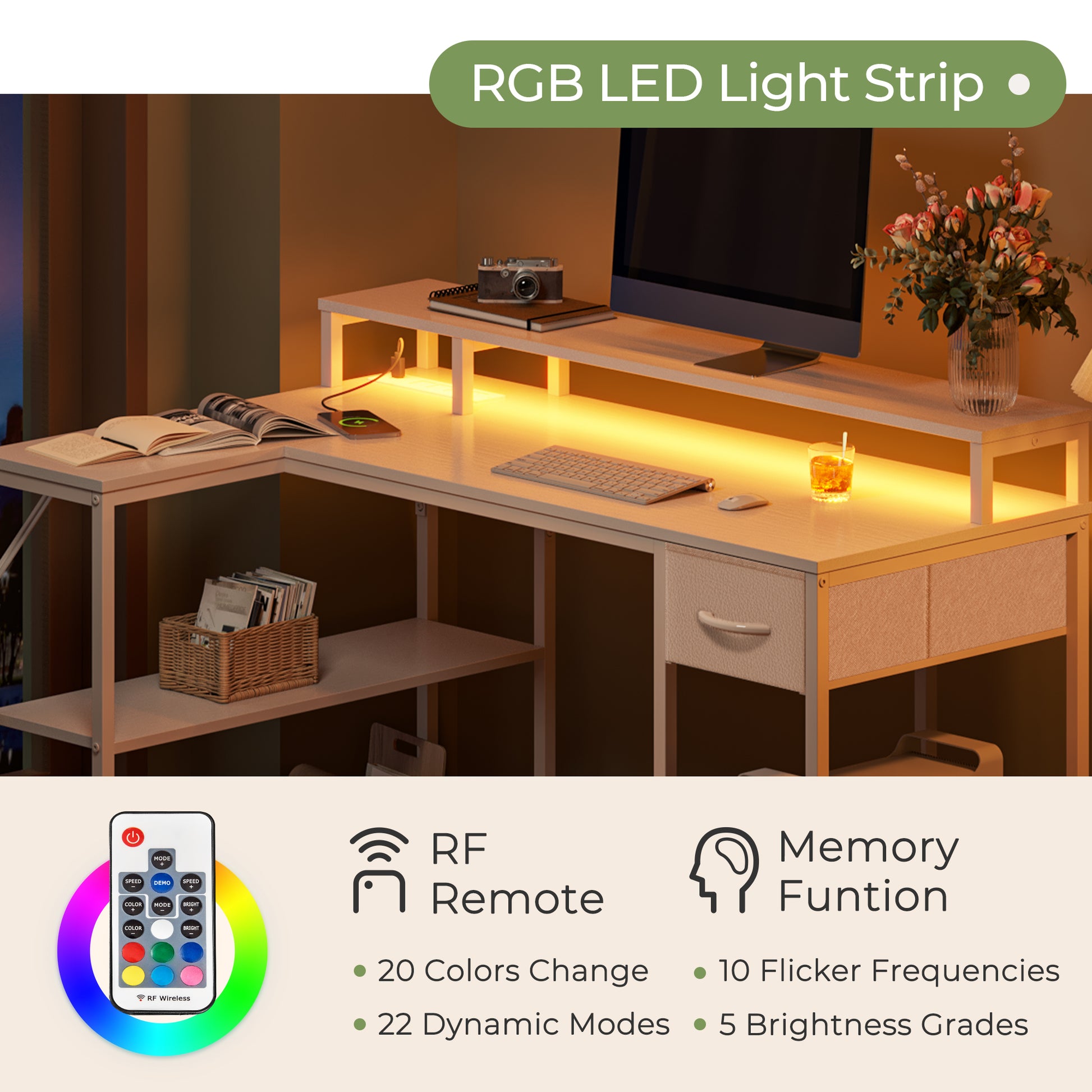 - 【L DESK WITH LED LIGHTS】PATENT PENDING! This home office desk features built-in LED lighting with 20 static colors, 22 dynamic modes, 10 speed grades and 5 brightness grades to create beautiful ambiance that enhances your room. The L shaped design suits for corner small space perfectly. This season's perfect Christmas gift for kids, boyfriend, family. A can't-go-wrong Christmas gift for loved ones. Inspire and surprise them right now. Plus: Contain patent pending drawer slide