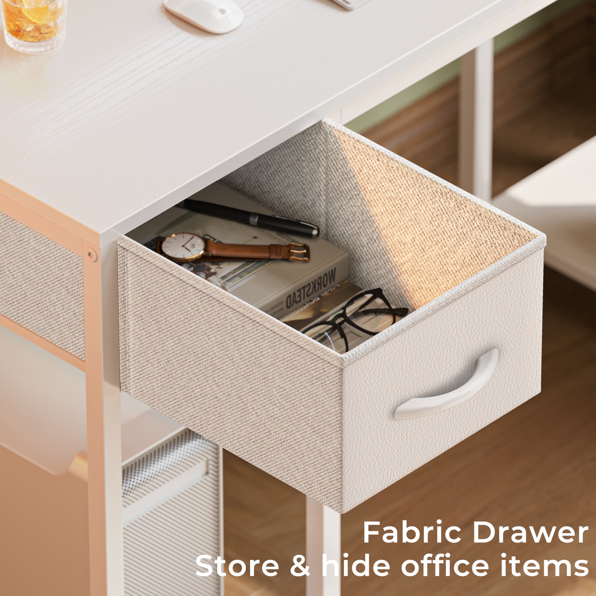 - 【DESK WITH STORAGE】The desktop and 2 storage shelves on the side allow you to store unlimited office supplies. The pc tower can be placed on the bottom shelf and there is a fabric drawer to store stationery and other privacy items. Super practical design!