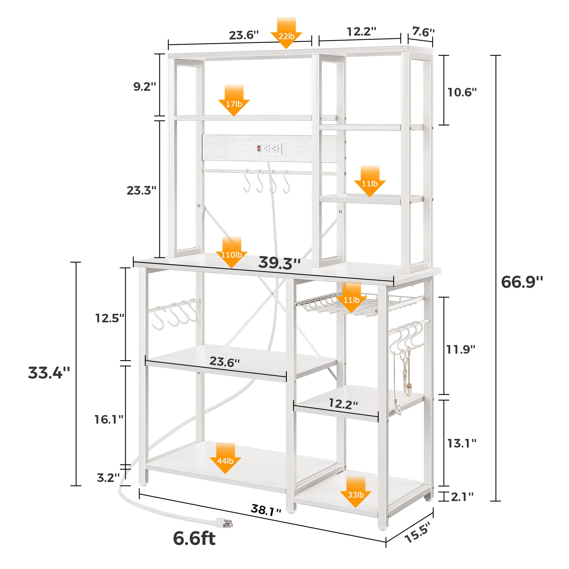 SUPERJARE Large Bakers Rack with Power Outlets, 6-Tier Microwave Stand, Coffee Bar with 12 S-Shaped Hooks, Kitchen Shelf with Wire Basket, 39.3 x 15.5 x 66.9 Inches, White
