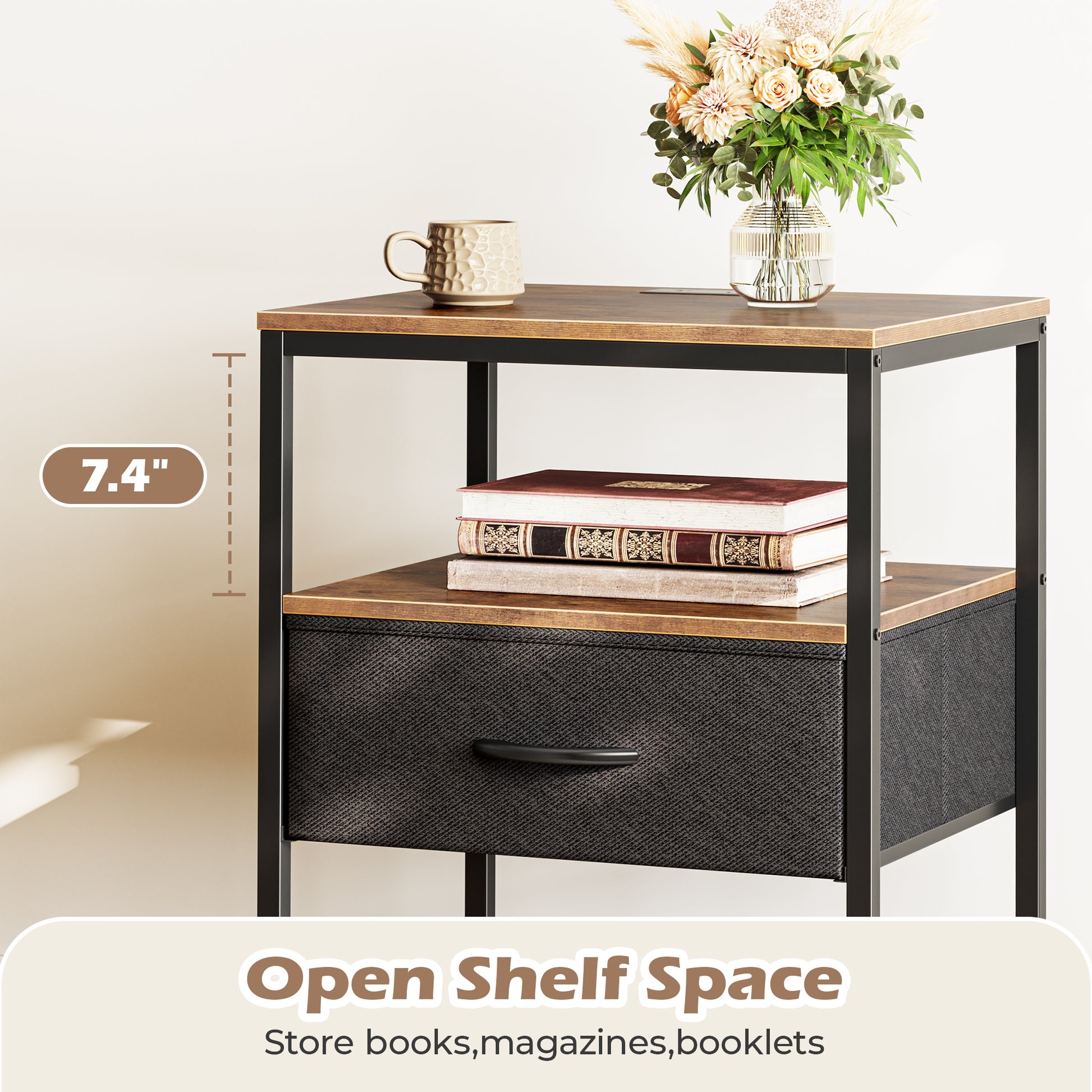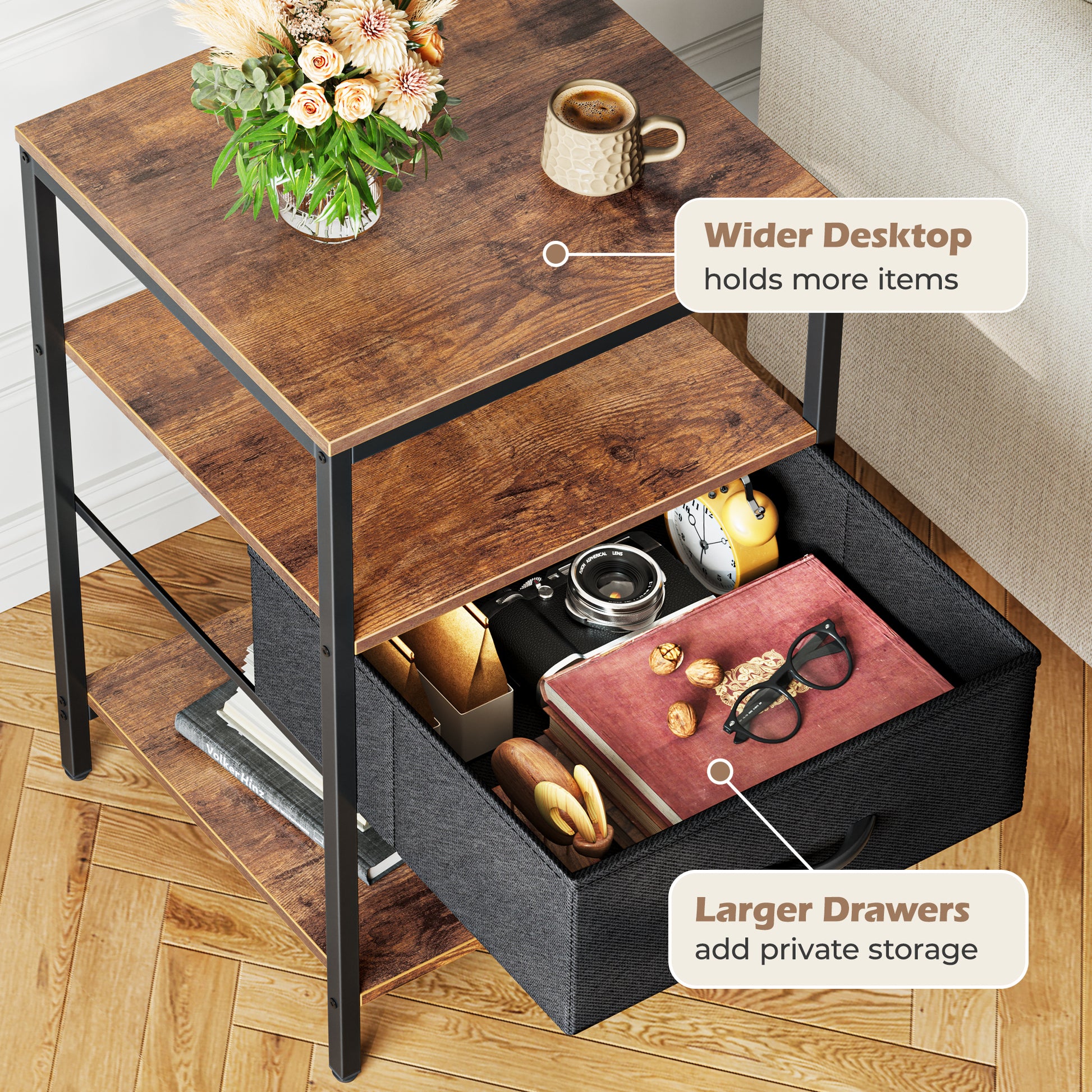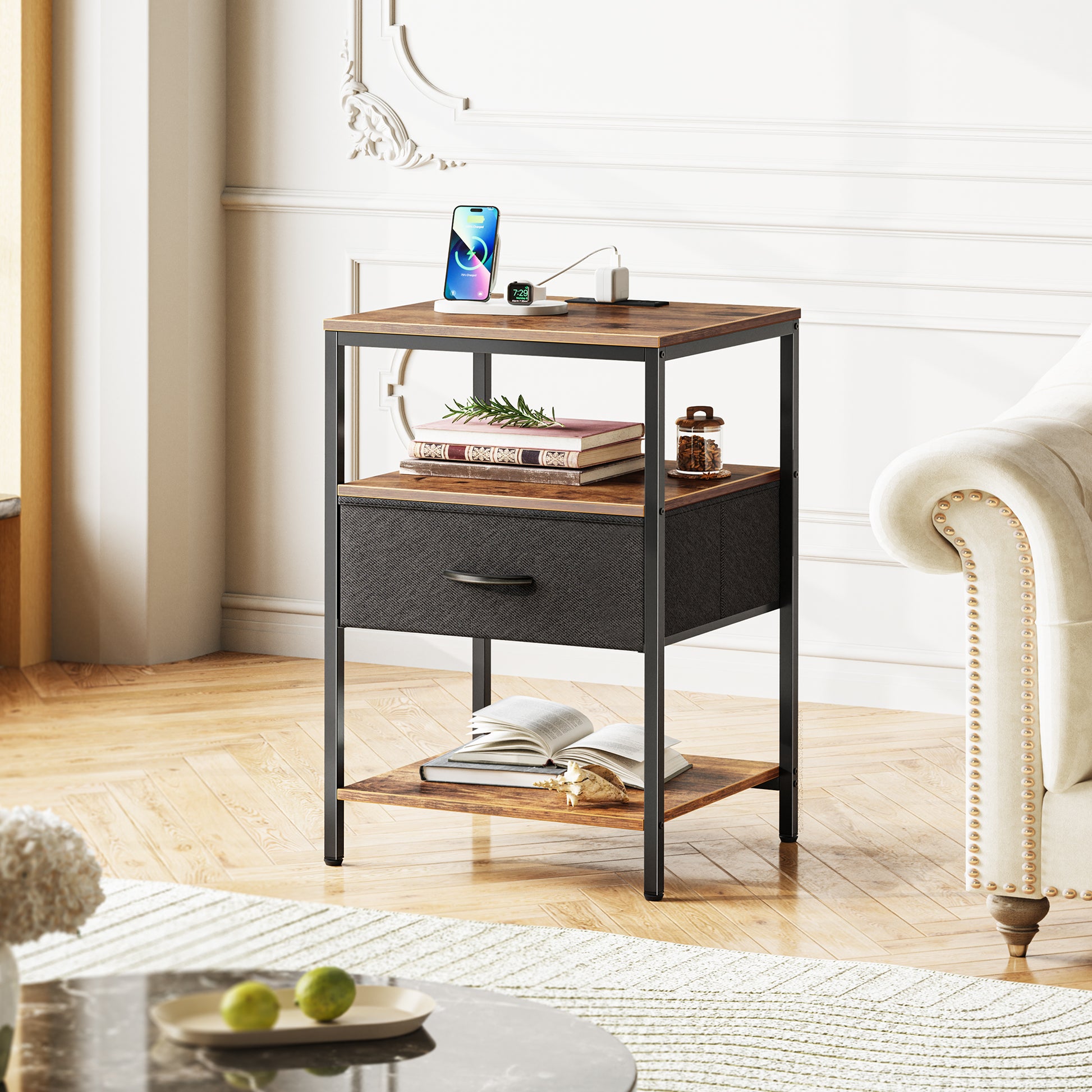 - 【Adjustable Drawer Setup】 Install your drawer in the middle or at the bottom to fit your space layout. This updated couch side table boasts 3 spacious shelves and a spacious fabric drawer, making it easy to organize everything from nighttime reads to various devices