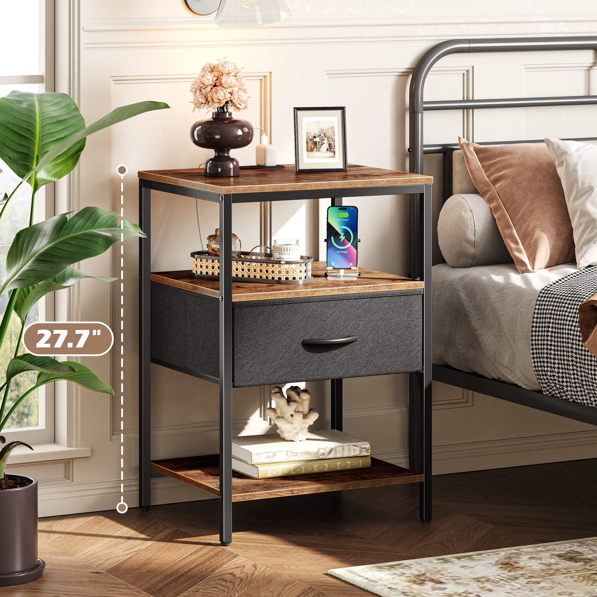 SUPERJARE Night Stand with Charger Station, 27.7 Inch Tall Nightstand with Adjustable Fabric Drawer, Bed Side Table, Fabric Drawer Dresser for Bedroom, Living Room, Rustic Brown and Black