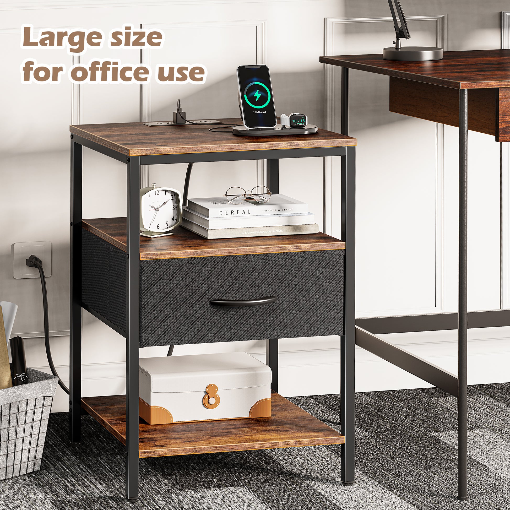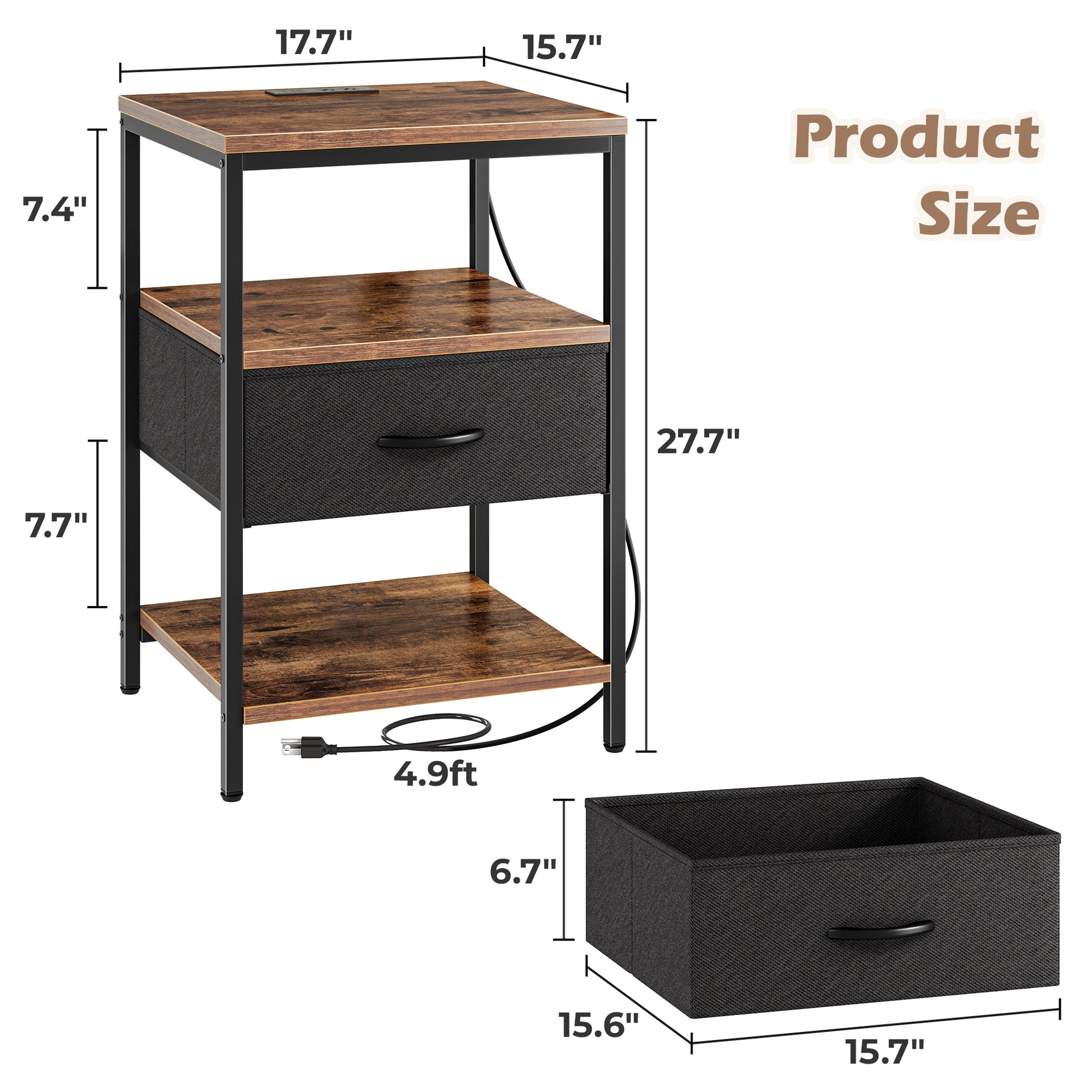 - 【Expanded Nightstand with Charging Station】 Larger and taller upgrade! This bedroom nightstand features with 1 USB port, 1 Type-C port and 2 AC outlets, perfect for your nighttime charging. The 15.7"D x 17.7"W x 27.7"H desktop and taller storage shelf tiers can hold everything you need — lamp, phone, tablet, reading books — charging and storage right beside you