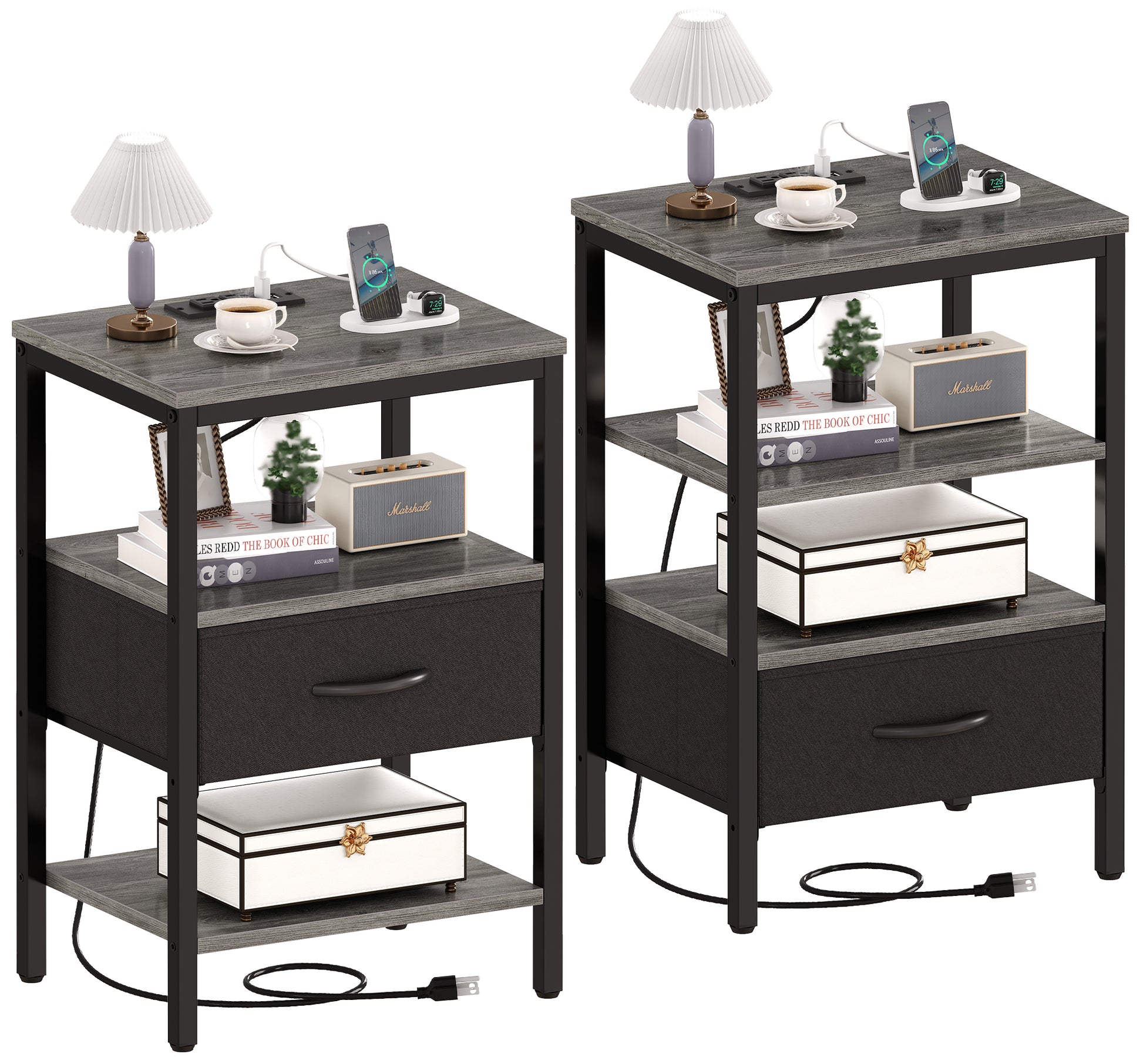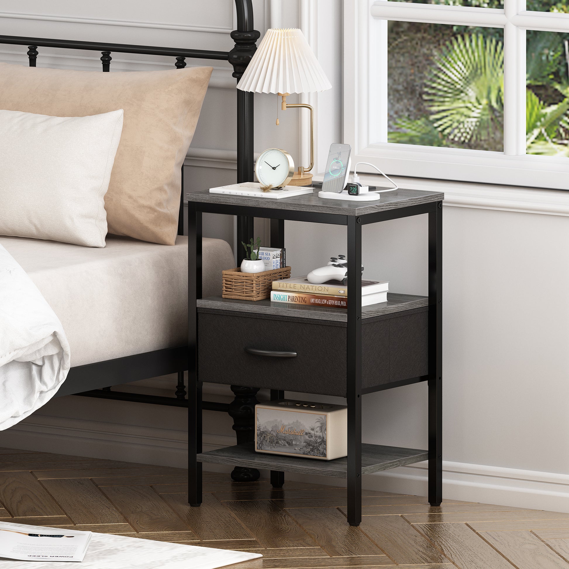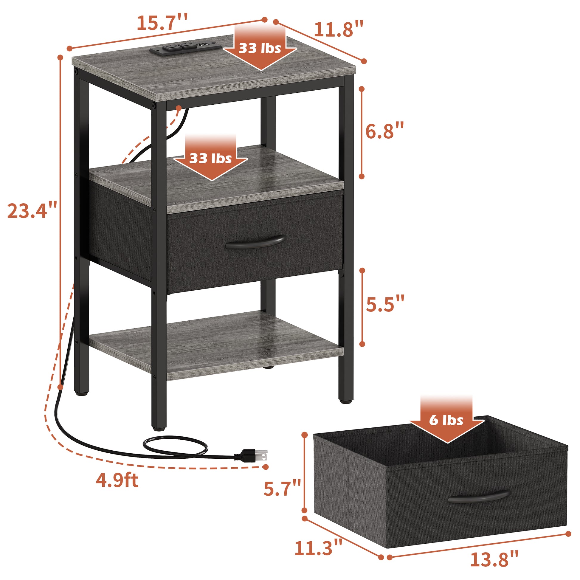 - [Go for a Long Time]: Charcoal gray wooden grain shelves blend black fabric and metal frame, making it a timeless classic. Sturdy P2 particle board, sturdy metal frame, and durable fabric drawer, all these work excellently to give this side table with charging station strong support
