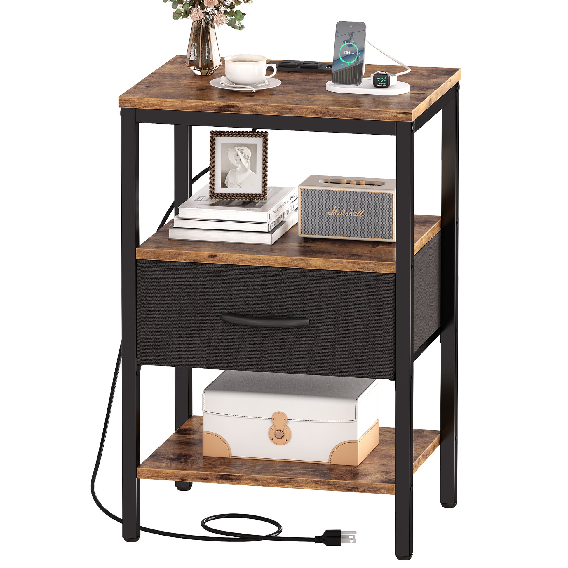 SUPERJARE Nightstand with Charging Station, Bed Side Table with Adjustable Fabric Drawer, 3-Tier Night Stand - Vintage Brown 8629ZC
