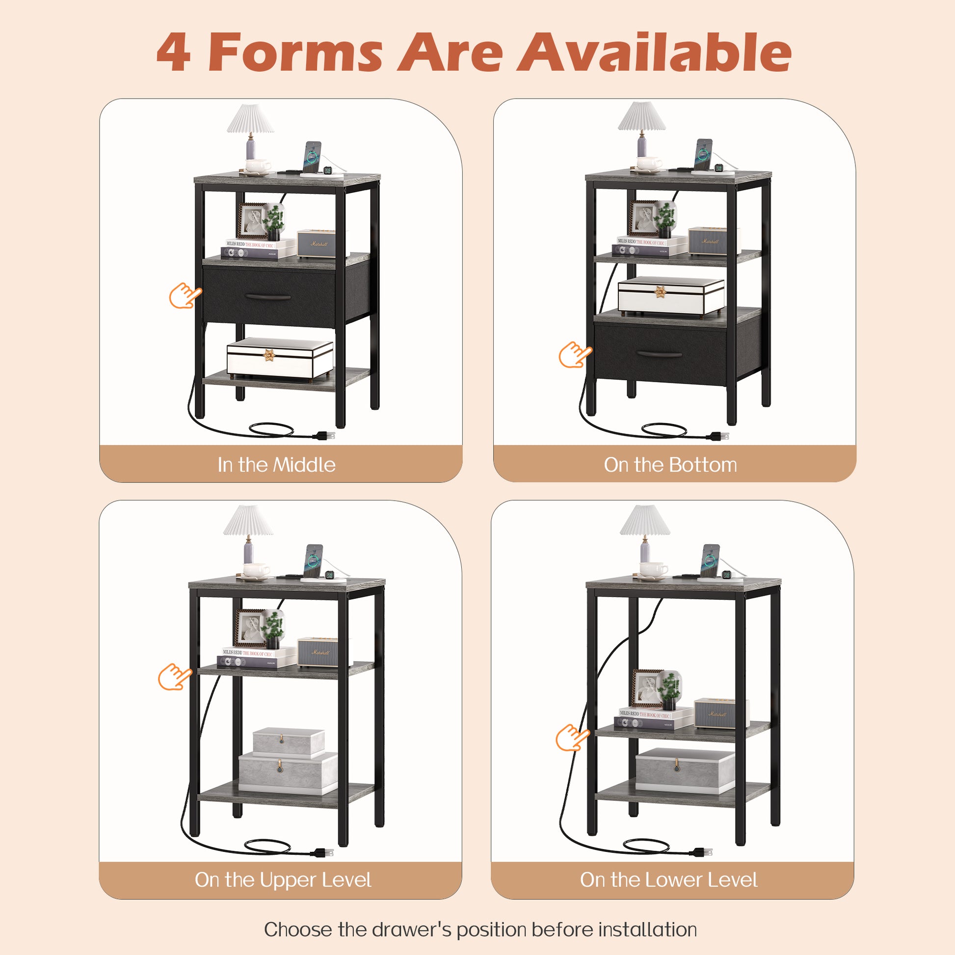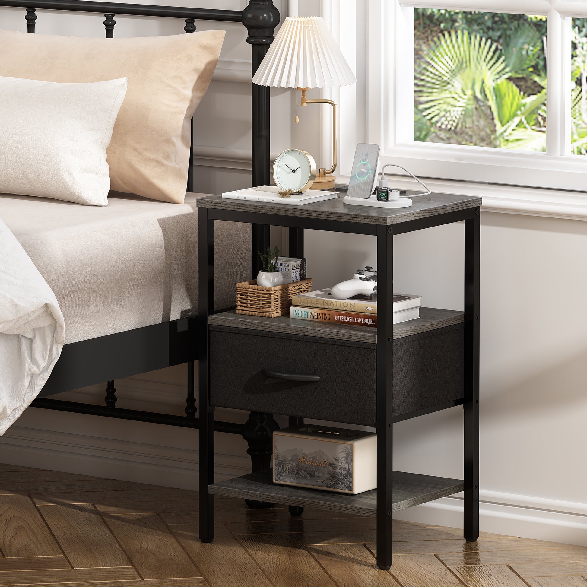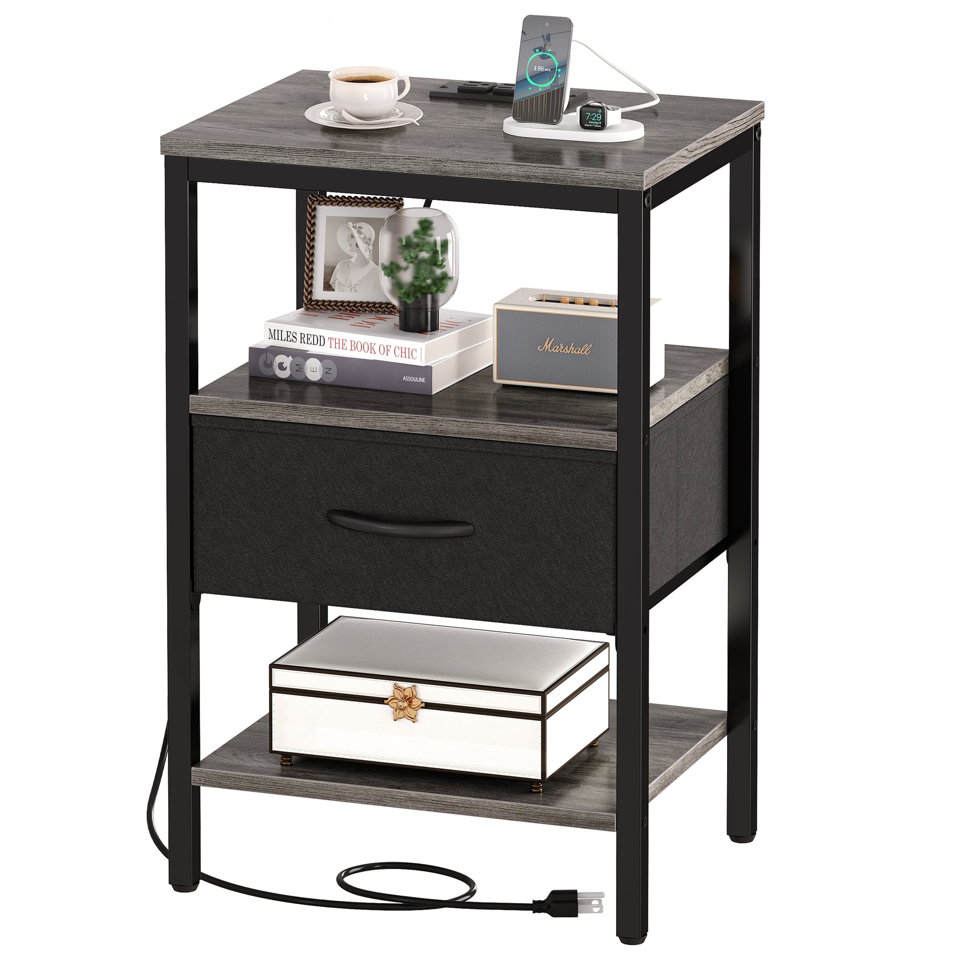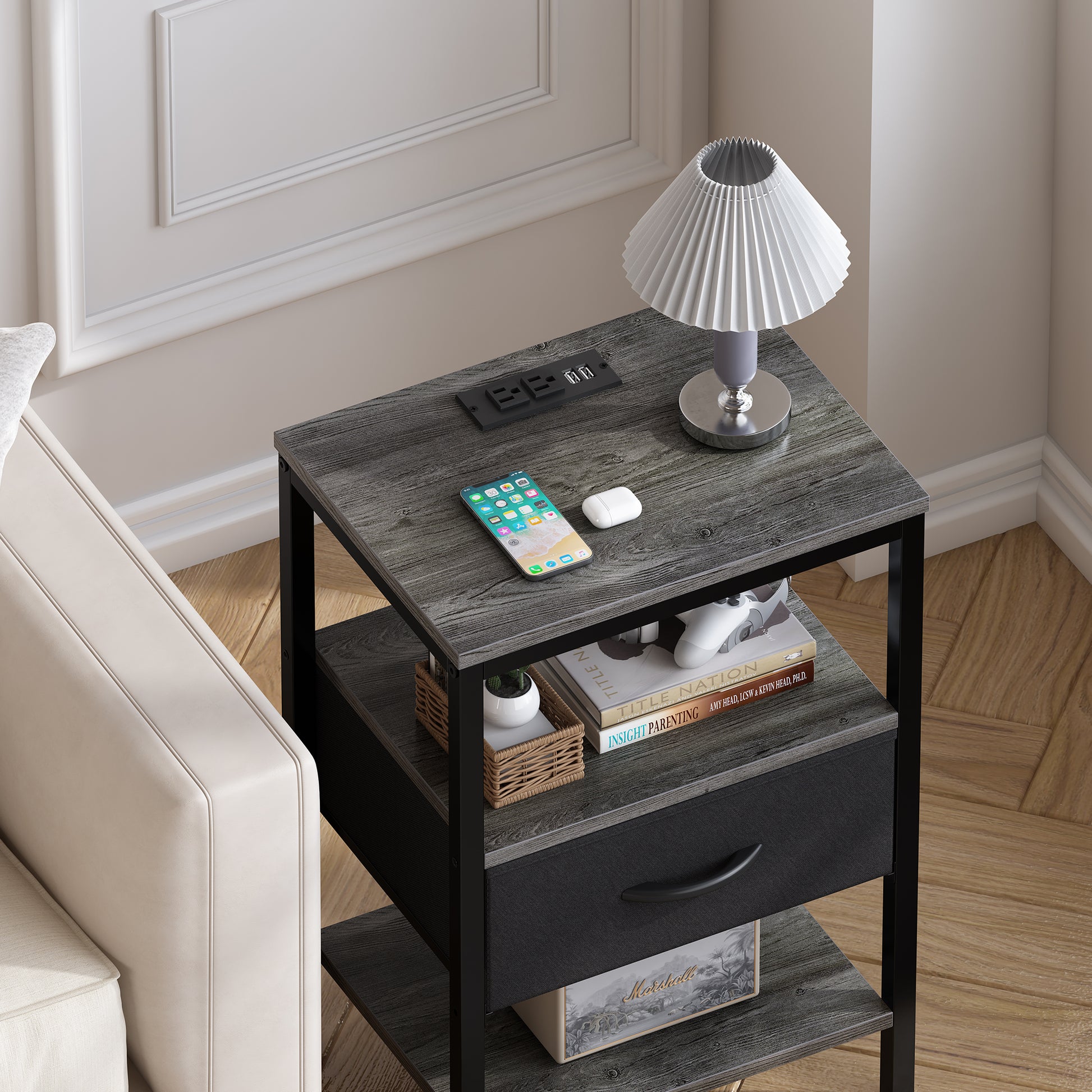 - [Go for a Long Time]: Charcoal gray wooden grain shelves blend black fabric and metal frame, making it a timeless classic. Sturdy P2 particle board, sturdy metal frame, and durable fabric drawer, all these work excellently to give this side table with charging station strong support