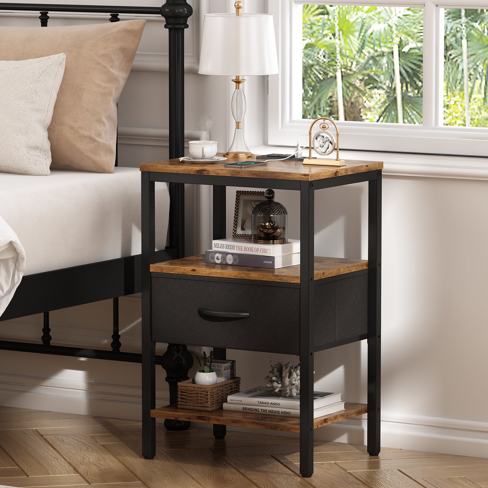 - [Go for a Long Time]: Vintage wooden grain shelves blend black fabric and metal frame, making it a timeless classic. Sturdy P2 particle board, sturdy metal frame, and durable fabric drawer, all these work excellently to give this side table with charging station strong support