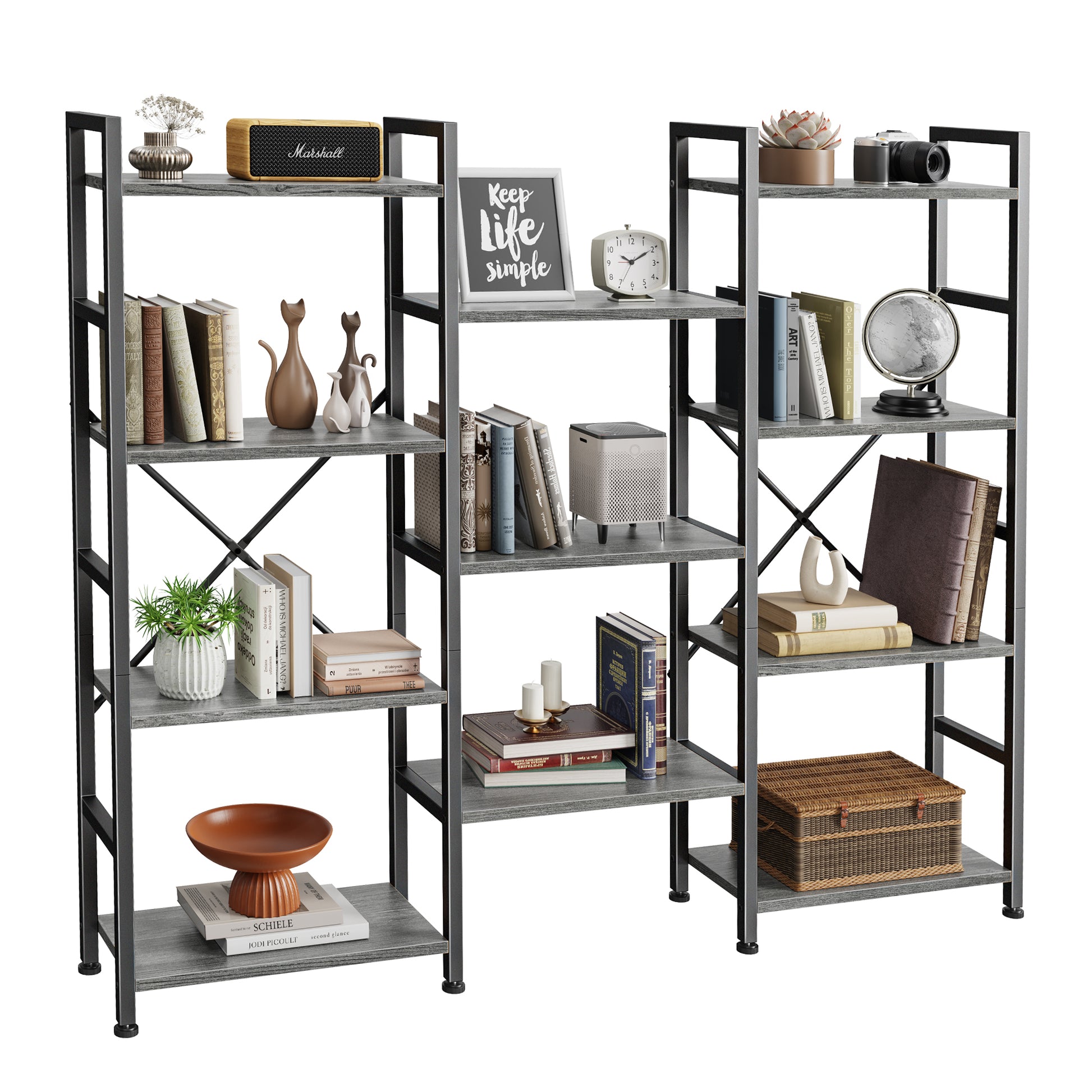 SUPERJARE Triple 4 Tier Bookshelf, Bookcase with 11 Open Display Shelves, Grey