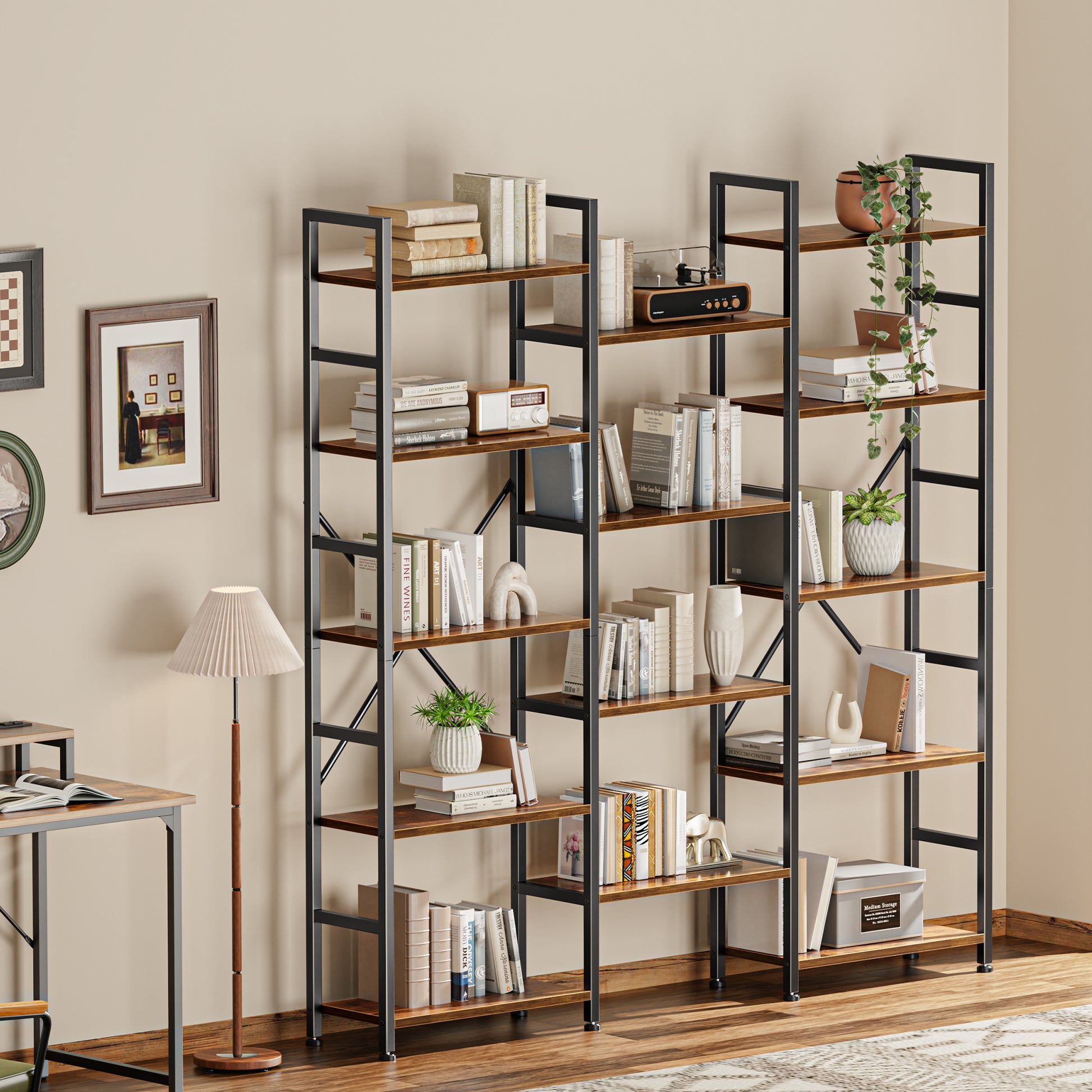 - 【STABLE AND DURABLE】Crafted from steel frame and particle board, this wide bookshelf has high stability and long service life, each shelf can hold up to 70 lbs.The bookshelves come with anti-tilt brackets so you can fasten them to the wall for support.