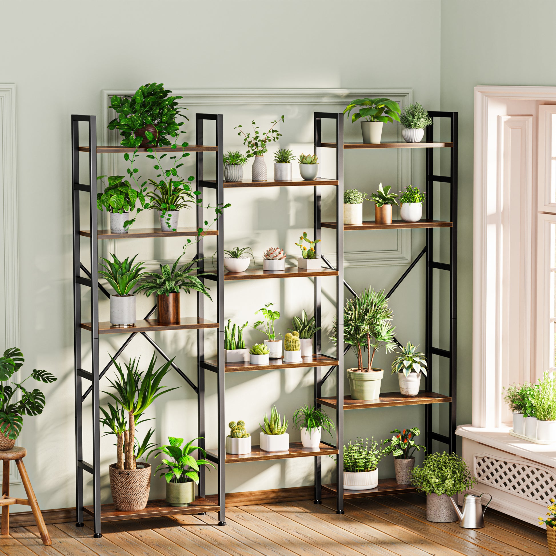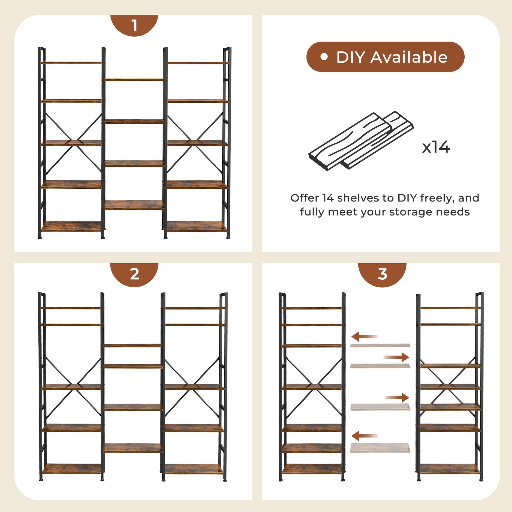 SUPERJARE Triple 5 Tier Bookshelf, Bookcase with 14 Open Display Shelves, Wide Book Shelf Book Case for Home & Office, Rustic Brown