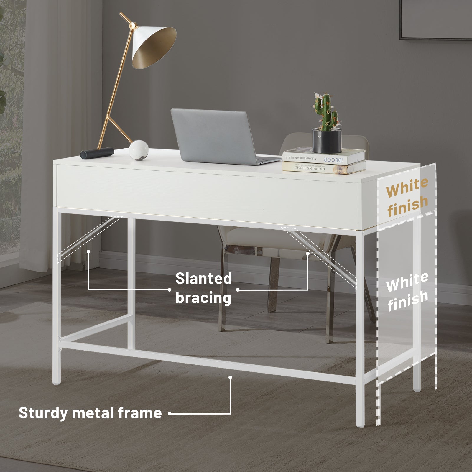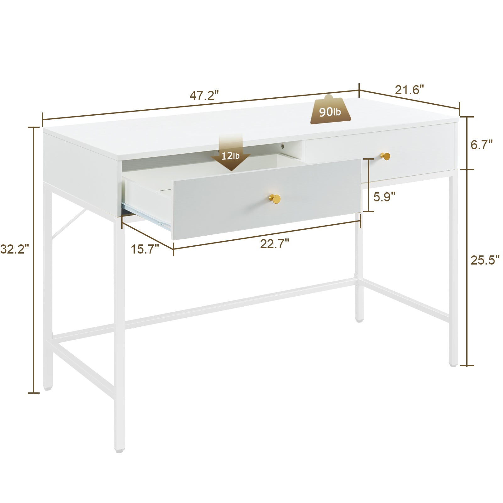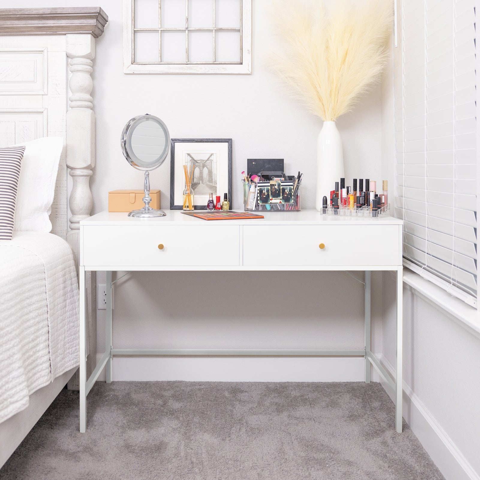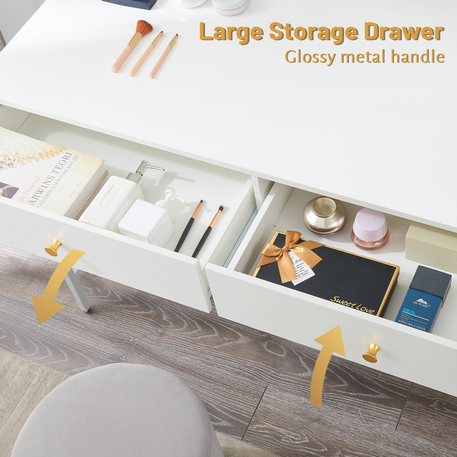 - [Go for Style]: Not only do the white body and legs make this makeup desk an elegant piece, which pleases your eyes, but also the glossy metal handles are icing on the cake. Perfect for upgrading your makeup time
