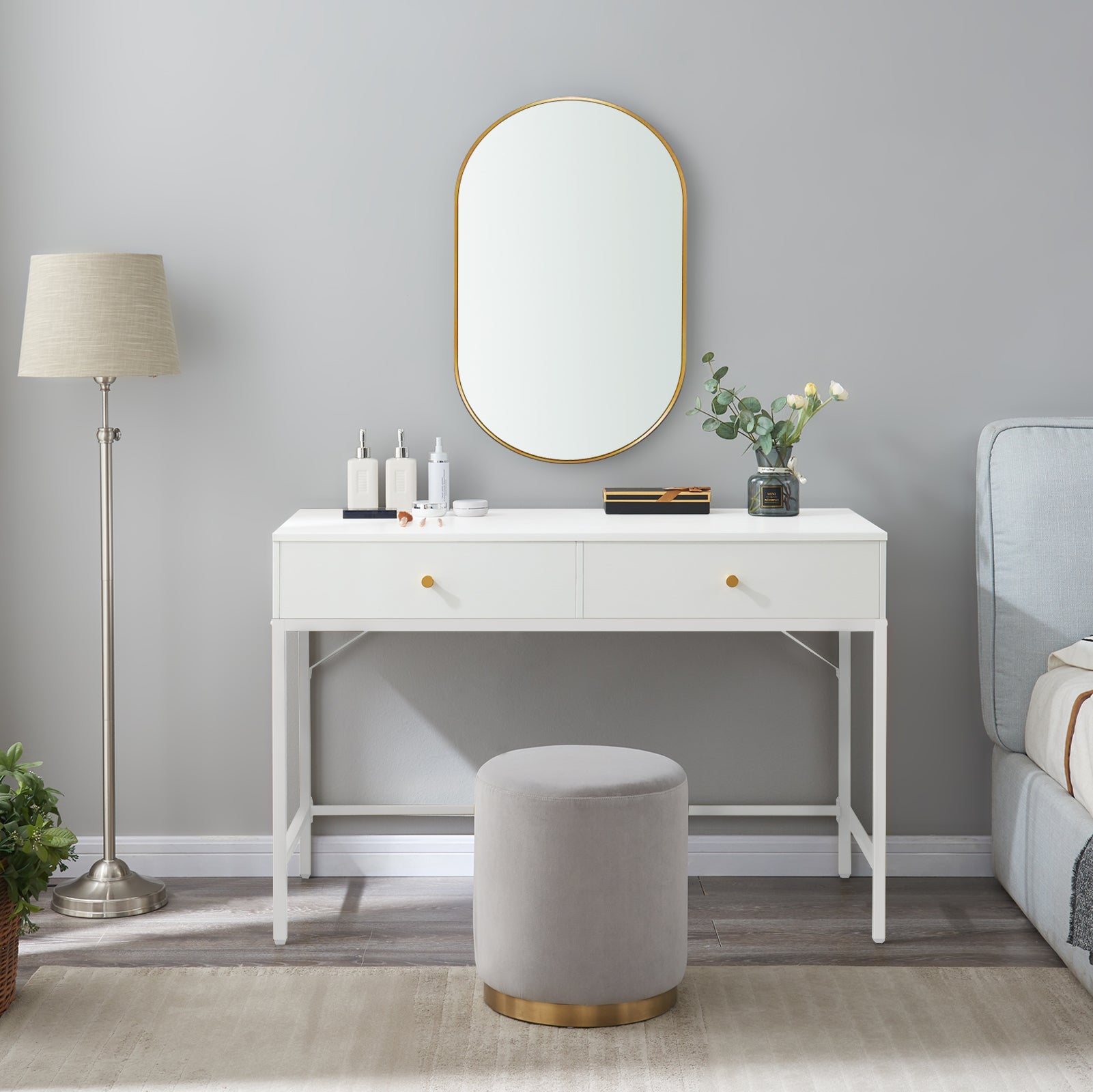 - [Daily Beauty Station]: A spacious dressing desk (47.2'' x 21.6'') makes every morning awaken a blessing for making up, as the fabulous white vanity table crafted with 2 Large Drawers keeps all your cosmetics within the reach